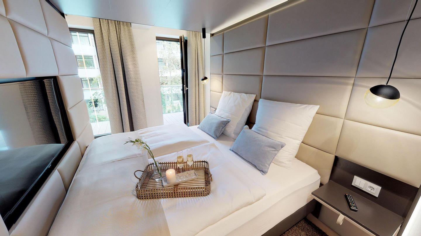 Sie erwartet eine gut ausgestattete Küchenzeile mit einer Essecke im Wohnbereich. Der helle, offene Wohn- und Essbereich wird durch eine gemütliche Couch und einen Sessel komplettiert. Das separate Schlafzimmer verfügt über ein Boxspring-Doppelbett, das durch Lamellenschiebetüren abgetrennt werden kann. Darüber hinaus gibt es ein modernes Badezimmer mit Dusche. Abgerundet wird das Apartment durch die eigene Sauna (2,37m x 1,19m).