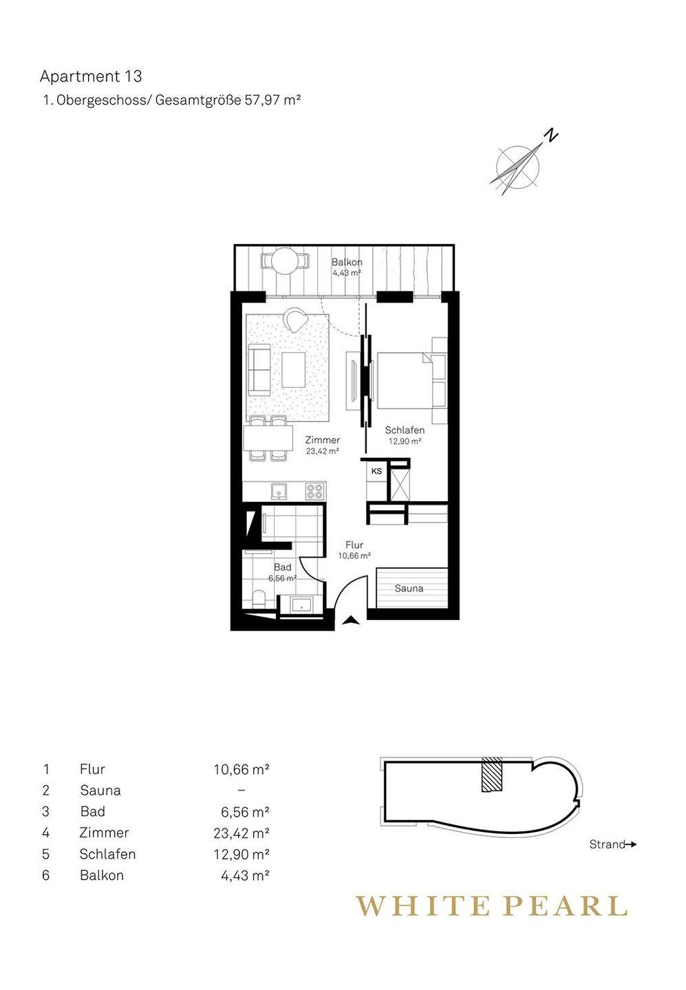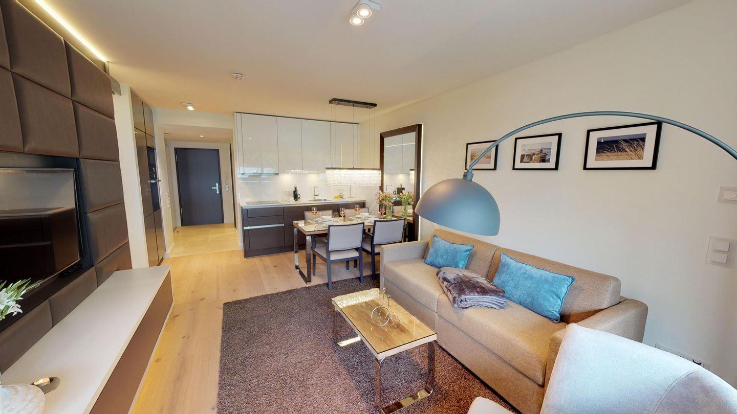 Nur wenige Meter vom Strand entfernt liegt das Luxusapartment 1.13 im 1. Obergeschoss des "White Pearl" und bietet auf 58 m² Platz für 2 Personen.