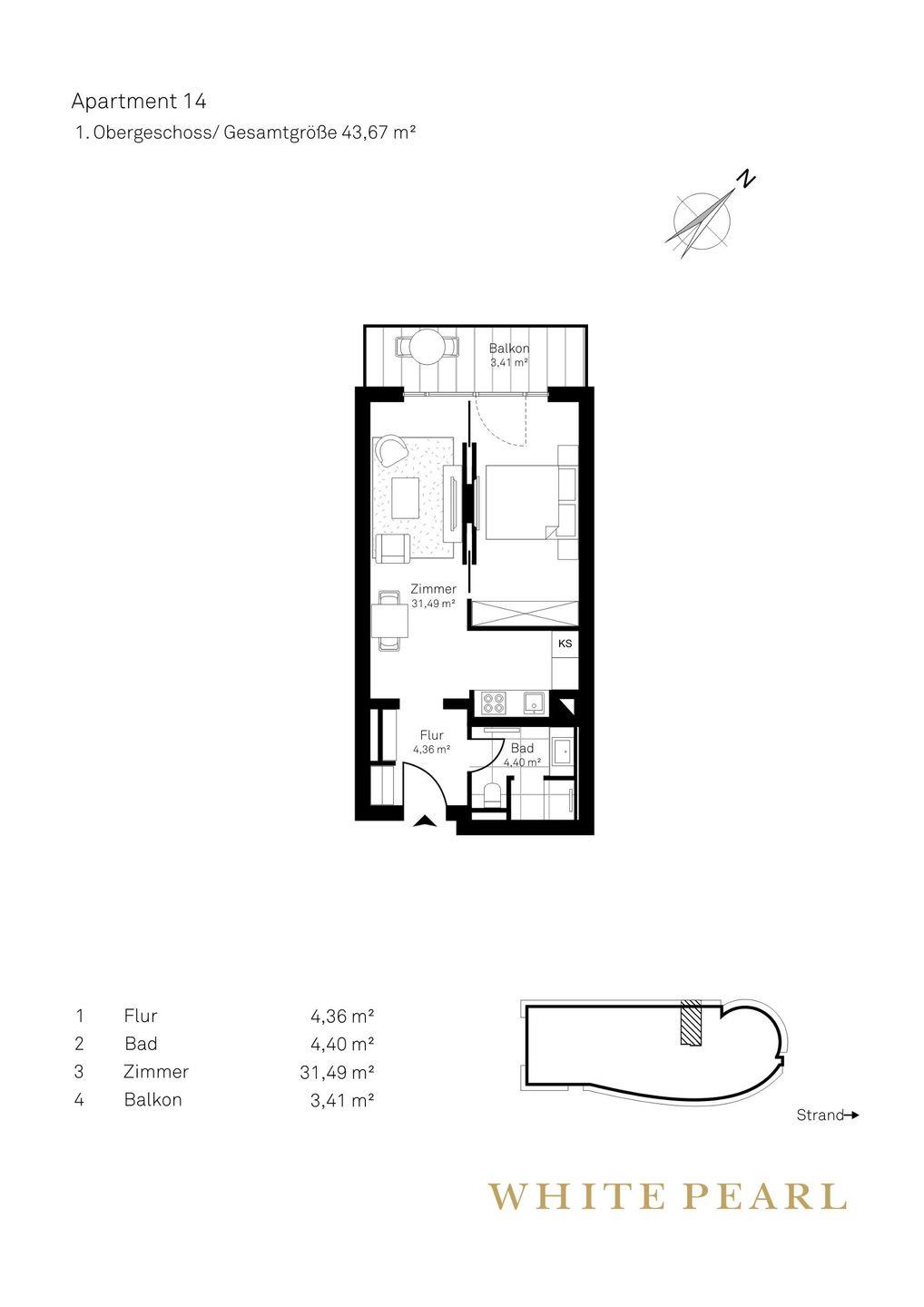 Nur wenige Gehminuten vom Strand entfernt befindet sich das Luxusapartment 1.14 im 1. Obergeschoss des "White Pearl", das auf 44 m² Platz für 2 Personen bietet – auch Ihr Hund ist willkommen!