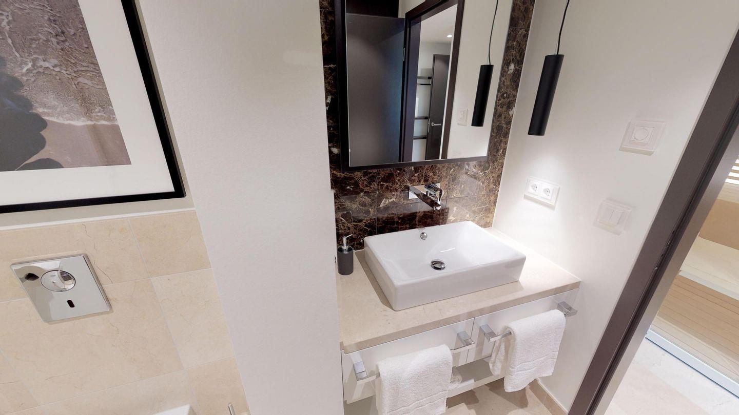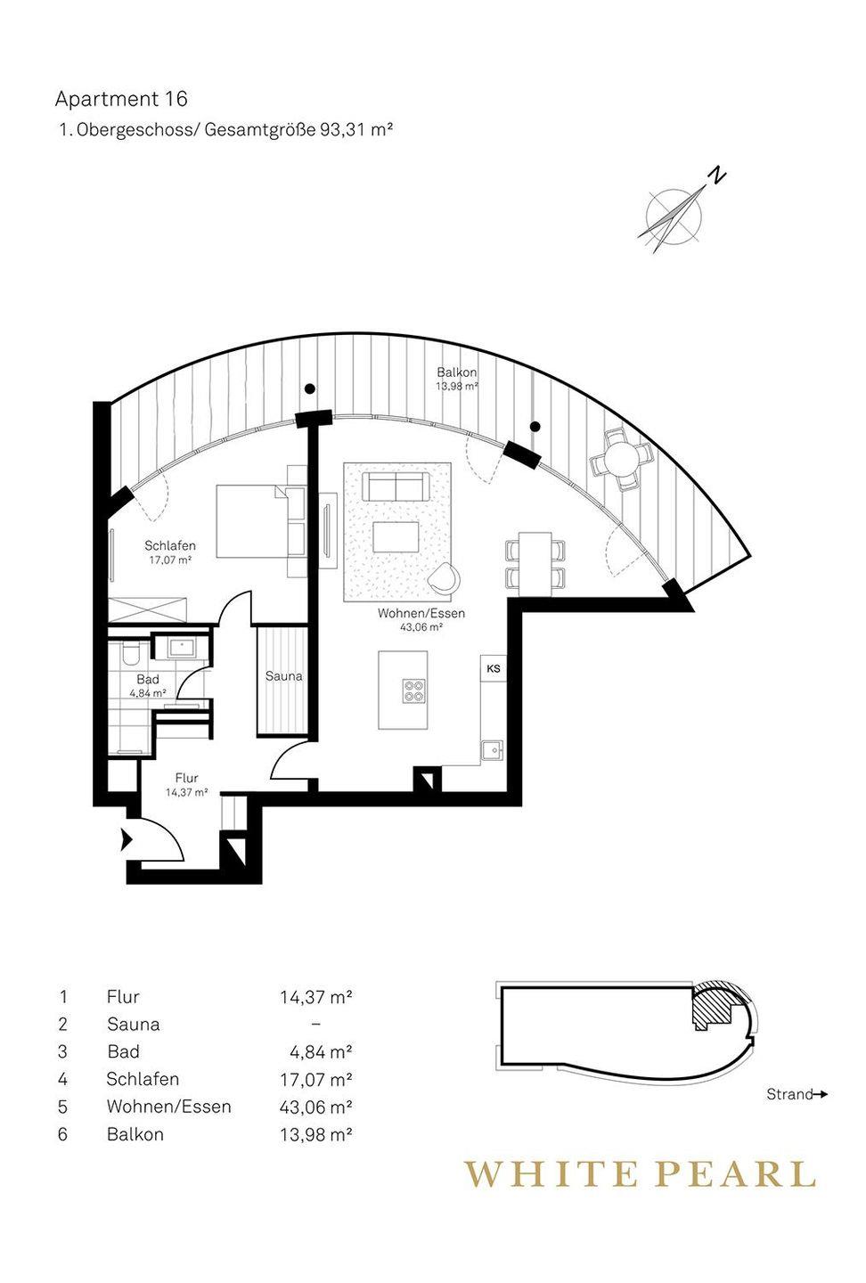 Highlights der Suite sind die eigene Sauna (2,37m x 1,19m) sowie der möblierte Balkon, der entspannte Stunden an der frischen Meeresluft ermöglicht! Zur Wohnung gehört ein Tiefgaragenstellplatz.