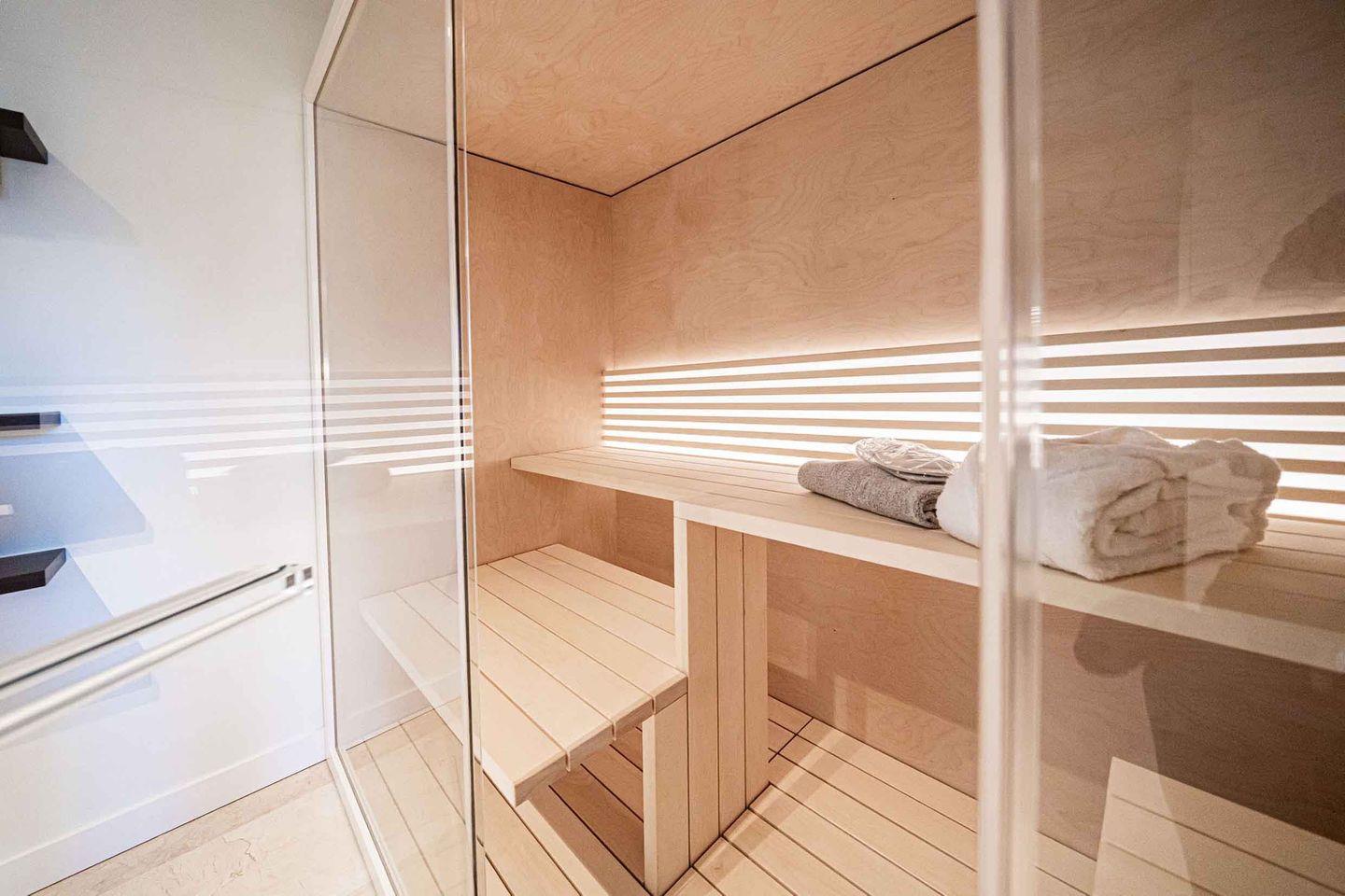 Zu den Highlights der Suite gehören eine eigene Sauna (2,37m x 1,19m) sowie der möblierte Balkon, der zu entspannten Stunden an der frischen Luft einlädt. Zur Wohnung gehört ein Tiefgaragenstellplatz.