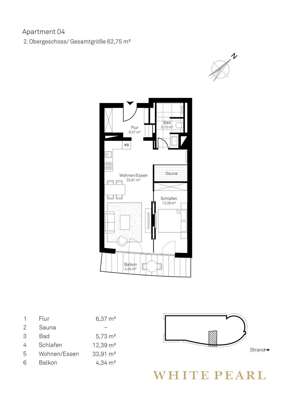 Nur wenige Gehminuten vom Strand entfernt befindet sich das Luxusapartment 2.04 im 2. Obergeschoss des "White Pearl", das auf 63 m² Platz für 2 Personen bietet.