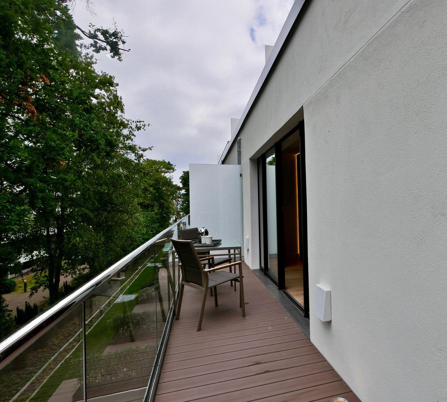 Highlights des Apartments sind die eigene Sauna (2,37m × 1,19m) sowie der möblierte Balkon mit Sonnenliegen, der entspannte Stunden an der frischen Meeresluft ermöglicht! Zur Wohnung gehört ein Tiefgaragenstellplatz. Diese Wohnung ist barrierefrei gem. LBO.
