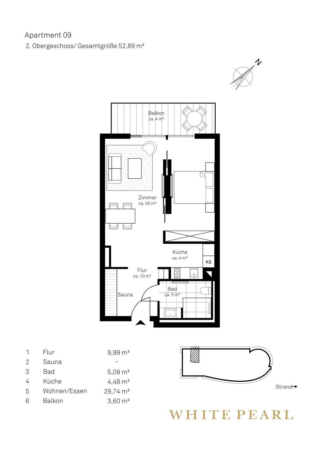 Nur wenige Gehminuten vom Strand befindet sich das Luxusapartment 2.09 im 2. Obergeschoss des "White Pearl" und bietet Platz für 2 Personen auf 53 m².