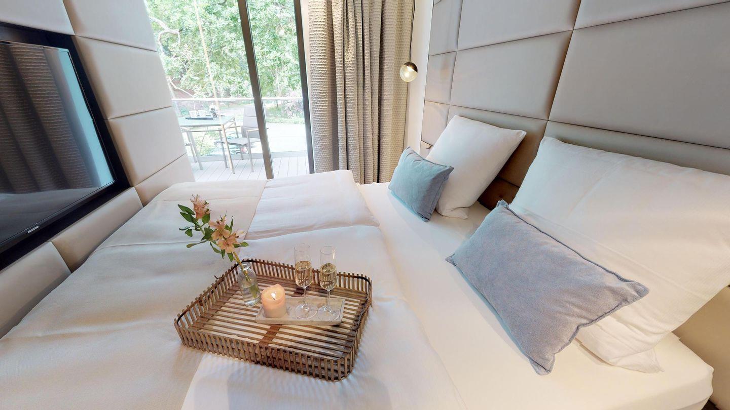 Es erwartet Sie eine gut ausgestattete Küchenecke mit einer separaten Essecke im Wohnbereich. Abgerundet wird der offene Wohn- Essbereich durch ein Sofa und einen Sessel. Das separate Schlafzimmer mit Boxspring-Doppelbett wird durch Lamellen-Schiebetüren abgetrennt. Des Weiteren gibt es ein modernes Bad mit Dusche.