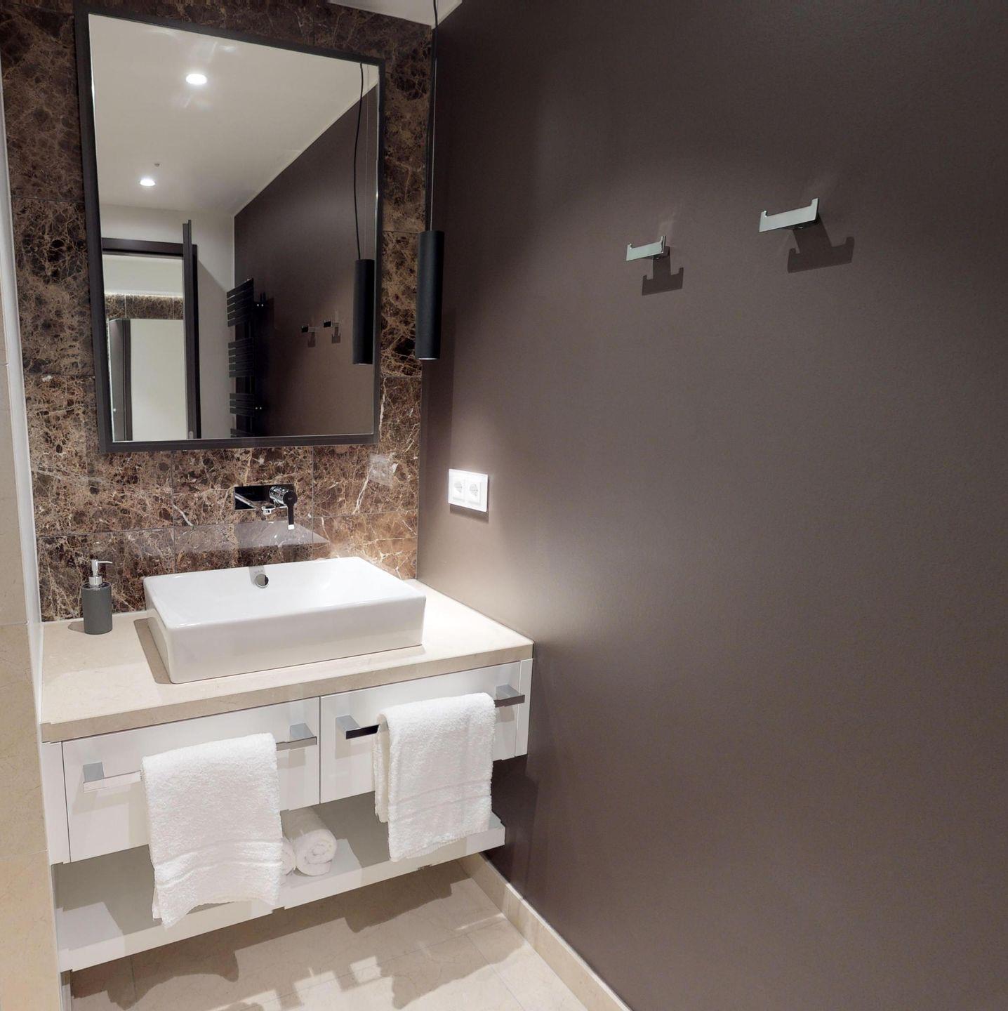 Das Apartment verfügt über eine voll ausgestattete Küchenecke mit einem Essbereich, der an das Wohnzimmer angrenzt. Der offene Wohn- und Essbereich wird durch zwei bequeme Sessel ergänzt. Im separaten Schlafzimmer befindet sich ein Boxspring-Doppelbett, das durch Lamellen-Schiebetüren abgetrennt werden kann. Zusätzlich gibt es ein luxuriöses Badezimmer mit Dusche.