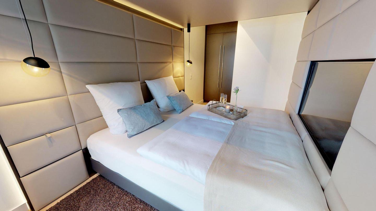 Es erwartet Sie eine gut ausgestattete Küchenzeile mit einer separaten Essecke im Wohnbereich. Abgerundet wird der offene Wohn- Essbereich durch ein Sofa und einen Sessel. Das separate Schlafzimmer mit Boxspring-Doppelbett wird durch Lamellen-Schiebetüren abgetrennt. Des Weiteren gibt es ein modernes Bad mit Dusche.