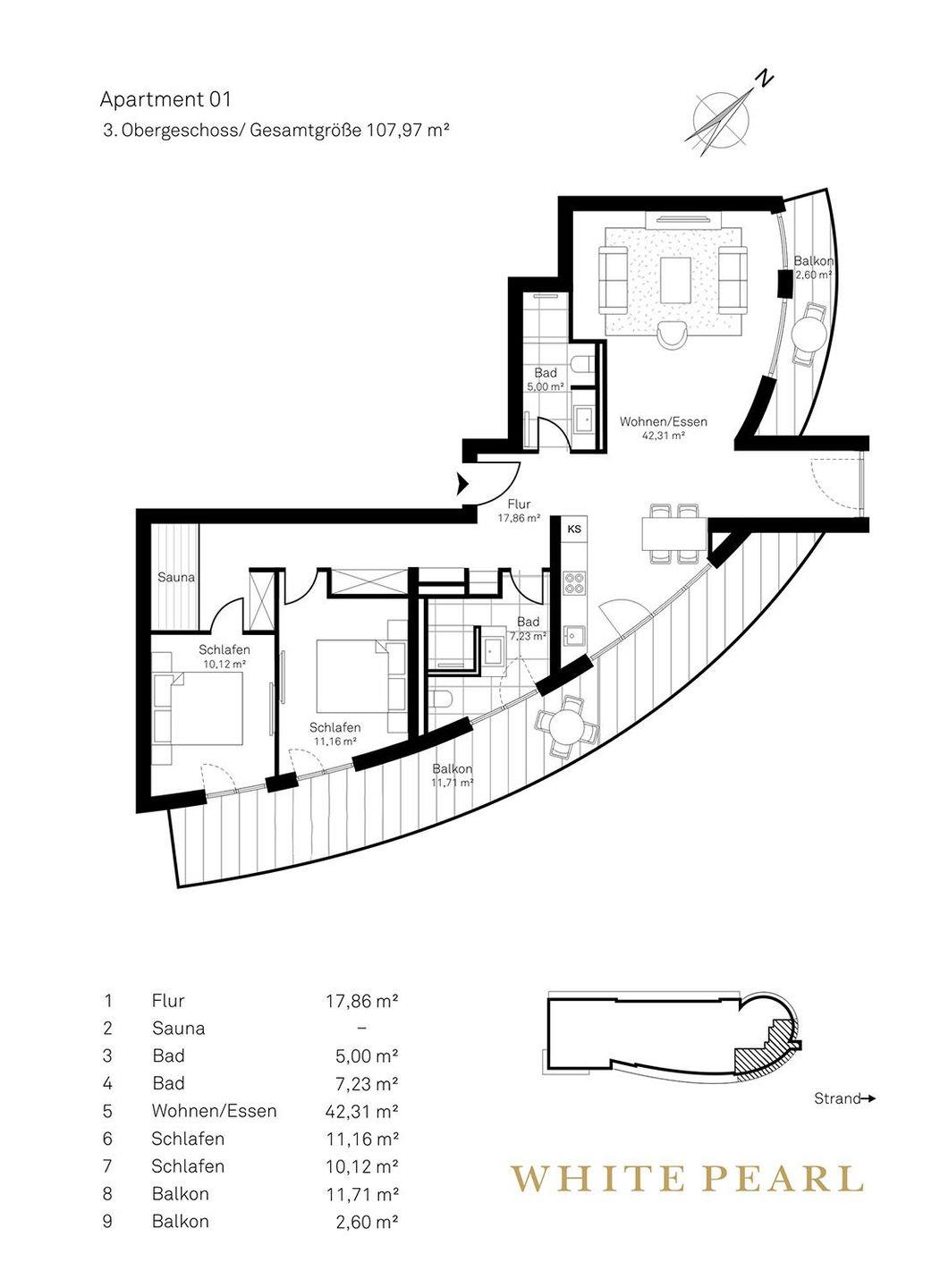 Highlights der Suite sind die eigene Sauna (2,37m x 1,19m) sowie die möblierten Balkone mit einem Strandkorb, die entspannte Stunden an der frischen Meeresluft ermöglichen! Zur Wohnung gehört ein Tiefgaragenstellplatz.