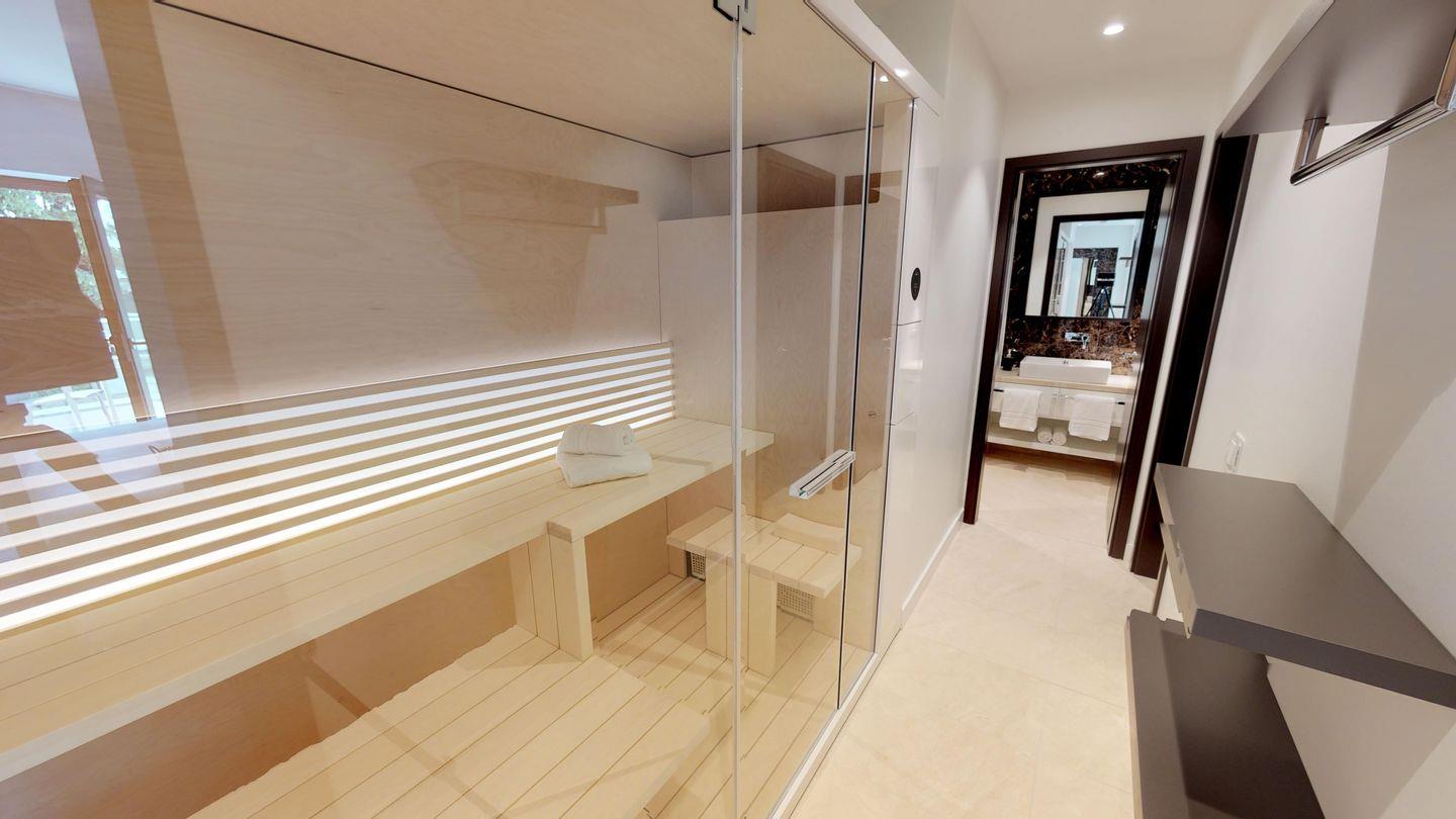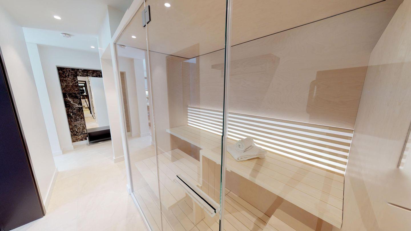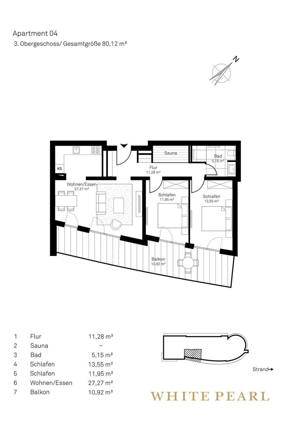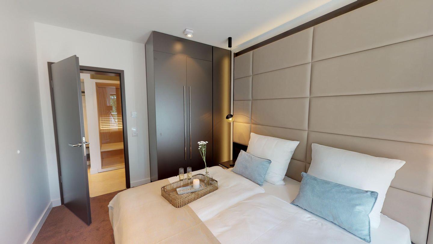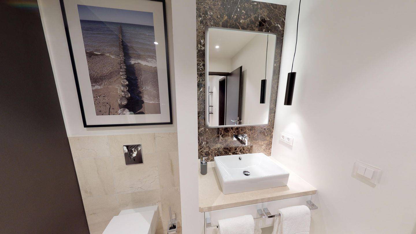 Highlights der Suite sind die eigene Sauna (2,37m x 1,19m) sowie der möblierte Balkon, der entspannte Stunden an der frischen Meeresluft ermöglicht! Zur Wohnung gehört ein Tiefgaragenstellplatz.
