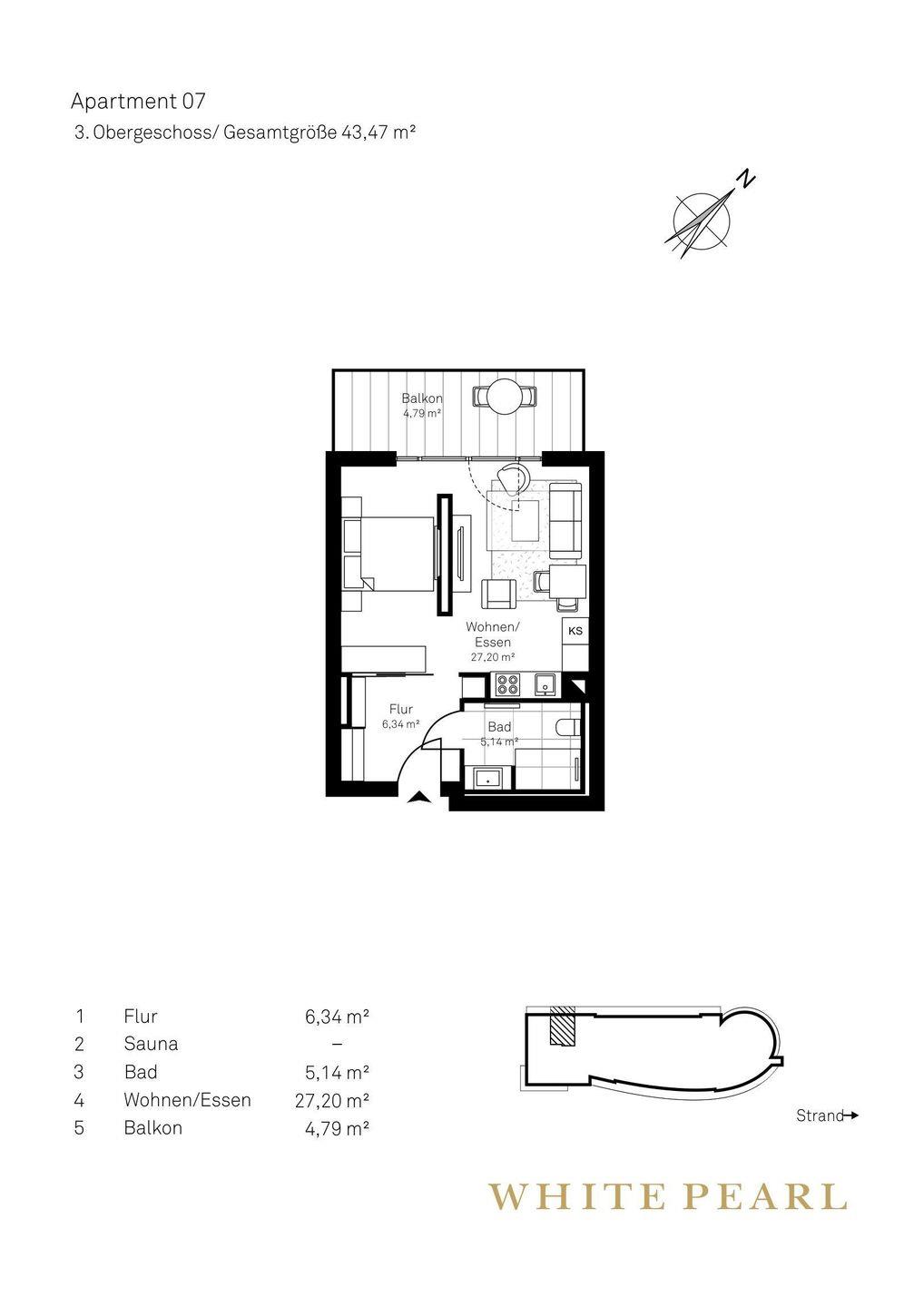 In traumhafter Lage an der Ostsee befindet sich das Luxusapartment 3.07 im 3. Obergeschoss des "White Pearl", das auf 43 m² Platz für 2 Personen bietet – auch Ihr Hund ist herzlich willkommen!