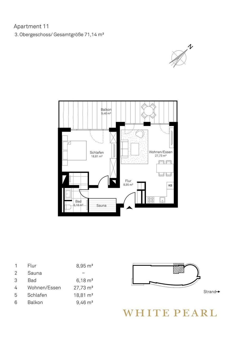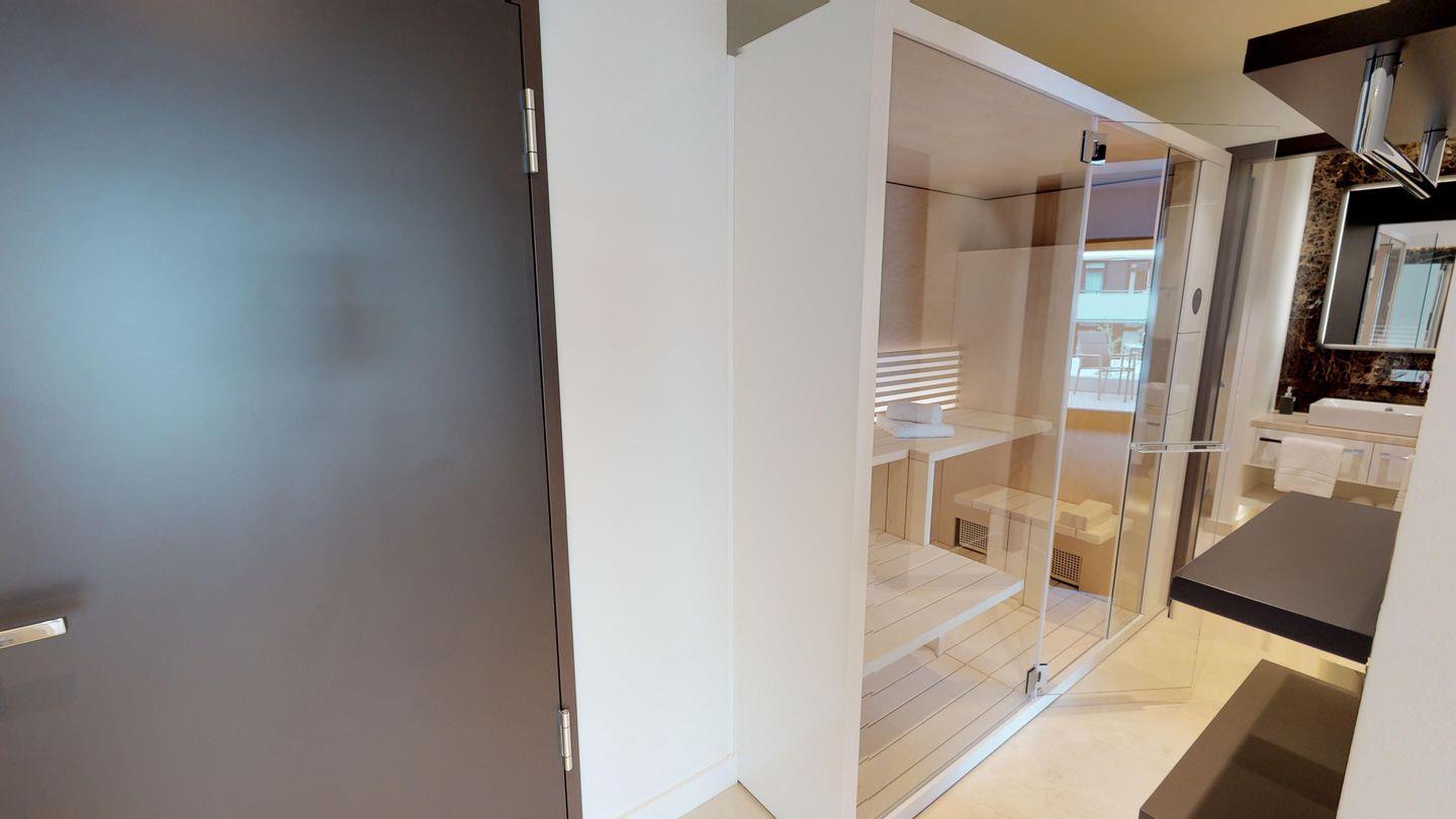 Zu den Highlights des Apartments gehören die eigene Sauna (2,37m x 1,19m) sowie der möblierte Balkon mit Sonnenliegen, der zu entspannten Stunden an der frischen Meeresluft einlädt! Zur Wohnung gehört ein Tiefgaragenstellplatz.