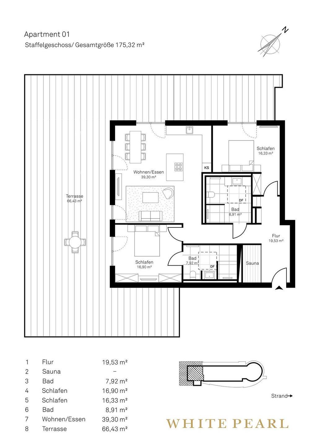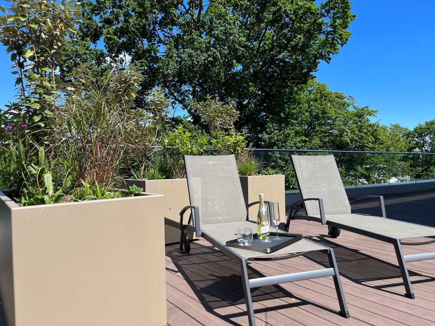 Zu den Highlights des Penthouses gehören eine eigene, gläserne Sauna (2,37m x 1,19m) sowie die herrliche, möblierte Dachterrasse mit Sonnenliegen und einem Strandkorb, die zu entspannten Stunden an der frischen Meeresluft einladen. Zur Wohnung gehört ein Tiefgaragenstellplatz. Unsere Appartements in der obersten Etage sind über die gemeinschaftliche Dachterrasse zu erreichen.