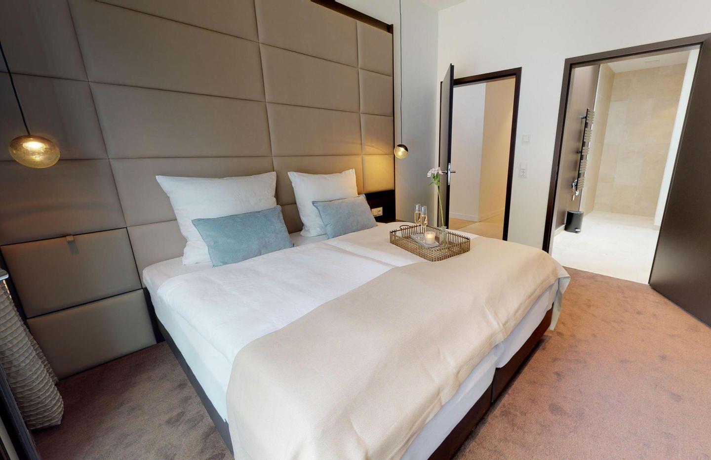 Das traumhafte Penthouse bietet einen lichtdurchfluteten Wohnbereich mit einer riesigen Fensterfront, der an die offene, voll ausgestattete Küchenzeile mit Kochinsel sowie an den Essbereich angrenzt. Das Sofa im Wohnbereich dient als Schlafmöglichkeit für zwei Personen. Weiterhin gibt es zwei separate Schlafzimmer, jeweils mit einem Boxspring-Doppelbett ausgestattet, und Zugang zur Dachterrasse, wobei ein Schlafzimmer direkt an ein Duschbad angrenzt. Ein weiteres luxuriöses Badezimmer mit Dusche rundet das Apartment ab.