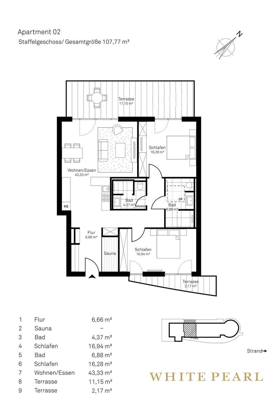 Zu den Highlights des Penthouses gehören eine eigene, gläserne Sauna (2,37m x 1,19m) sowie der herrliche, möblierte Balkon mit Sonnenliegen, der zu entspannten Stunden an der frischen Meeresluft einlädt. Zur Wohnung gehört ein Tiefgaragenstellplatz. Diese Wohnung ist barrierefrei gemäß der LBO. Unsere Appartements in der obersten Etage sind über die gemeinschaftliche Dachterrasse zu erreichen.