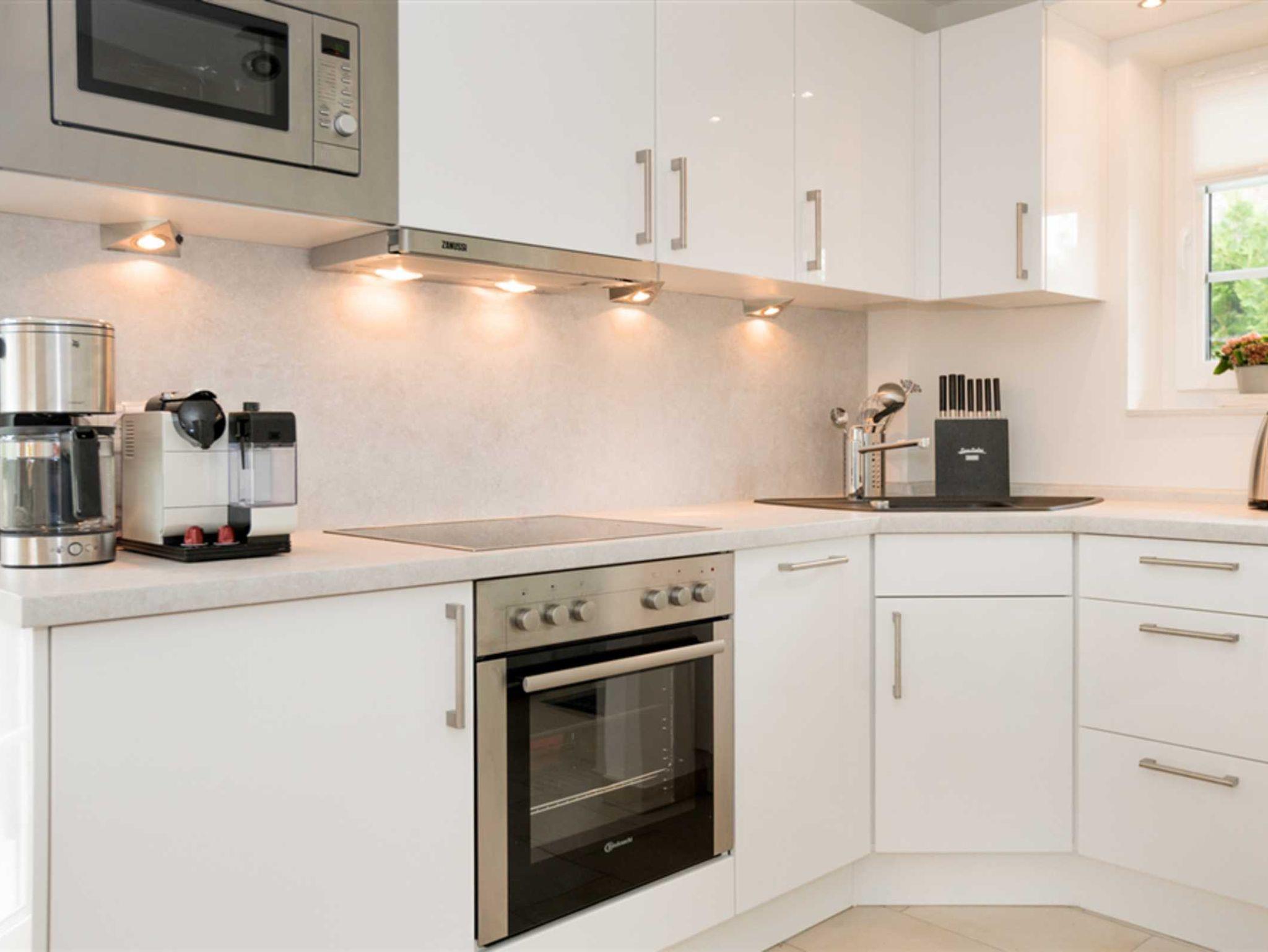 Im Erdgeschoss des Hauses finden Sie das wunderschön eingerichtete Wohn/Esszimmer mit der daran angrenzenden, komplett in weiß gehaltenen, voll ausgestatteten Küche. Das Wohnzimmer verfügt über ein großes Sofa und zwei Sessel - das Highlight hier ist natürlich der Kaminofen mit Sichtfenster, der Wohlfühlatmosphäre garantiert.