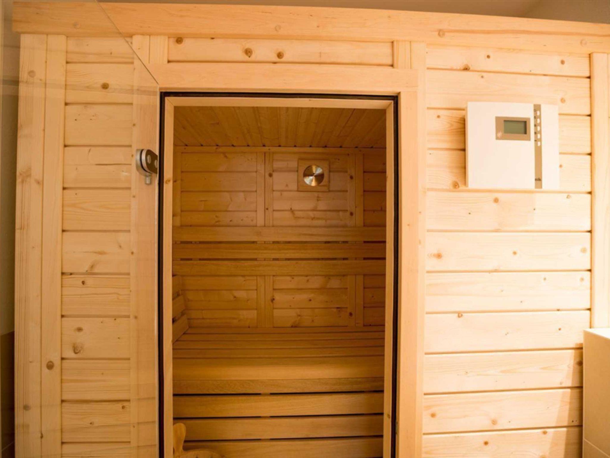 Das Badezimmer im Untergeschoss verfügt neben ebenerdiger Dusche zusätzlich noch über eine Whirlbadewanne sowie eine 2-Personen Sauna.
