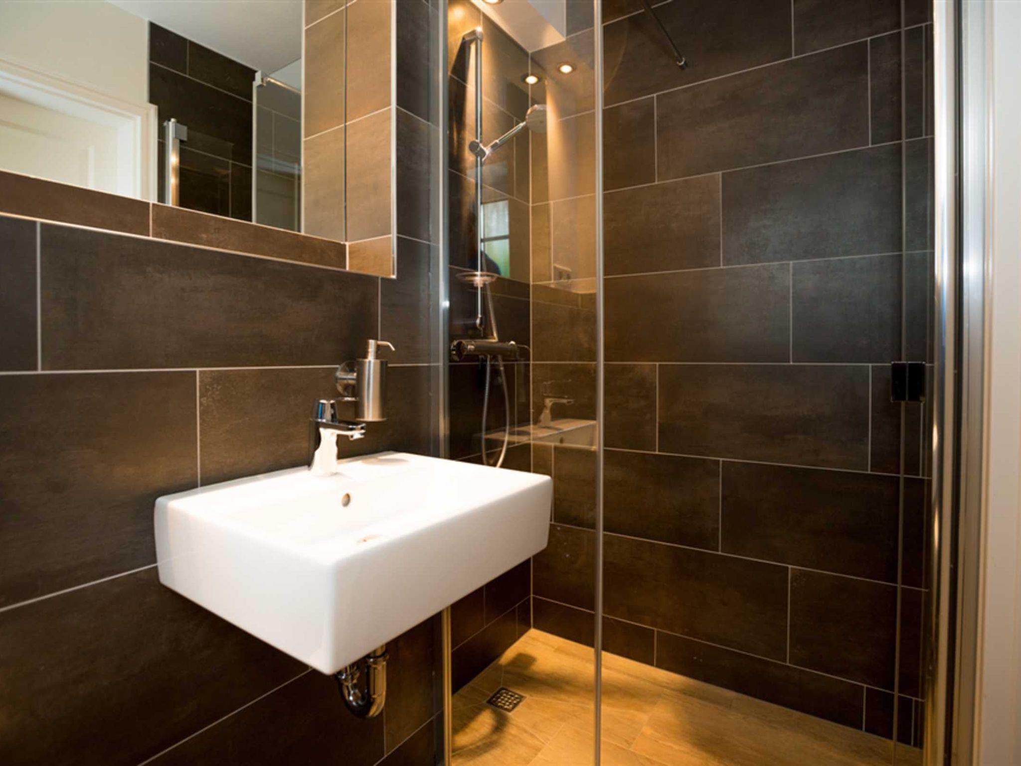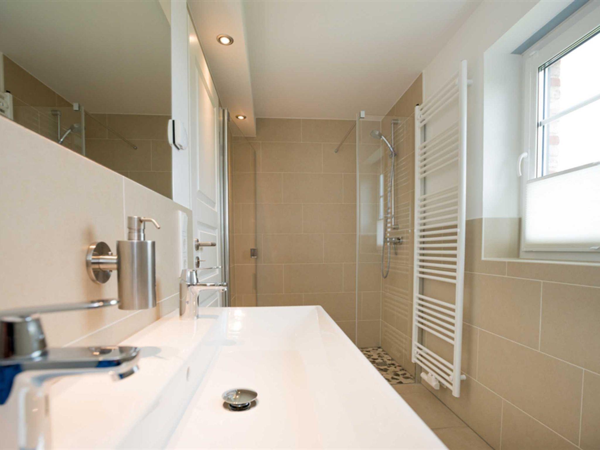 Das Haus verfügt insgesamt über vier Schlafzimmer. Im 1. Obergeschoss mit Dachschrägen sind ein größeres und ein sehr kleines Schlafzimmer vorzufinden. Die Betten haben die Größen 140x200cm und 180x200cm. Das in Sandfarben gehaltene Bad im 1. OG verfügt über zwei Doppelwaschbecken, eine ebenerdige Dusche und eine Toilette. Im Untergeschoss finden Sie das dritte Schlafzimmer mit einem Doppelbett mit den Maßen 180x200cm, sowie ein weiteres Badezimmer.