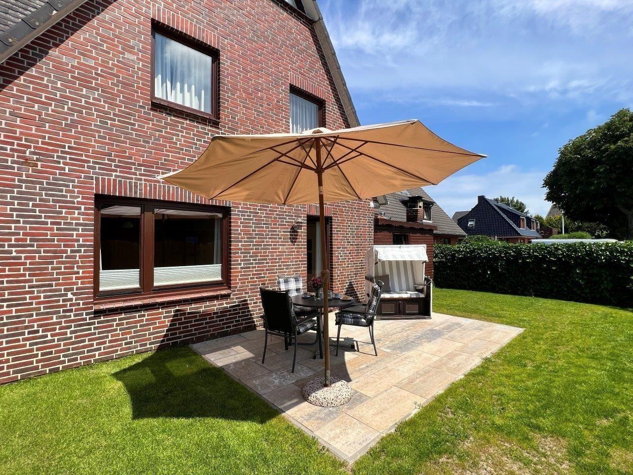 Das Appartement besitzt einen direkten Zugang von der Küche auf die neu gestaltete Terrasse. Hier befinden sich ein Strandkorb und weitere Sitzmöglichkeiten. Vor dem Haus befindet sich ein Parkplatz. Zusätzlich besteht die Möglichkeit Ihre Fahrräder in einem abschließbaren Häuschen unterzustellen.