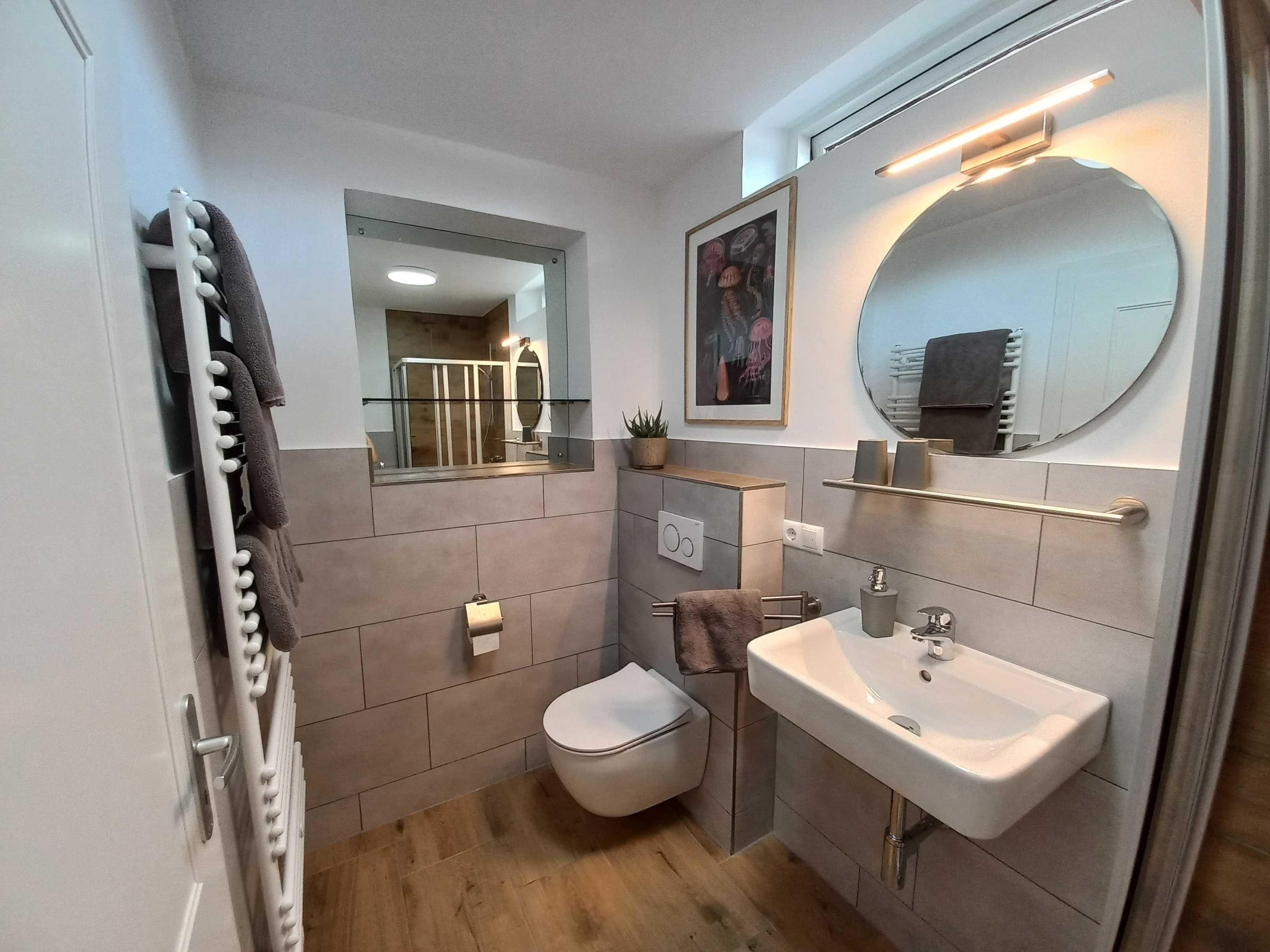 Die Wohnung verfügt über eine seperate Küche. Diese ist mit Spülmaschine, Herd mit Backofen, Mikrowelle, Wasserkocher und vielem mehr ausgestattet. Von hier gelangen Sie direkt auf die Terrasse. Der ebenfalls seperate Schlafraum ist mit einem Boxspringbett ausgestattet und verfügt über einen Fernseher mit Kabel TV. Der gemütlich eingerichtete Wohnraum hat einen Fernseher mit Kabel TV und einen Esstisch.