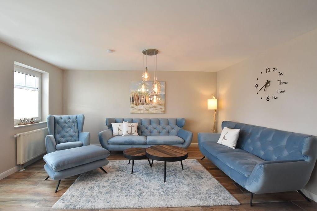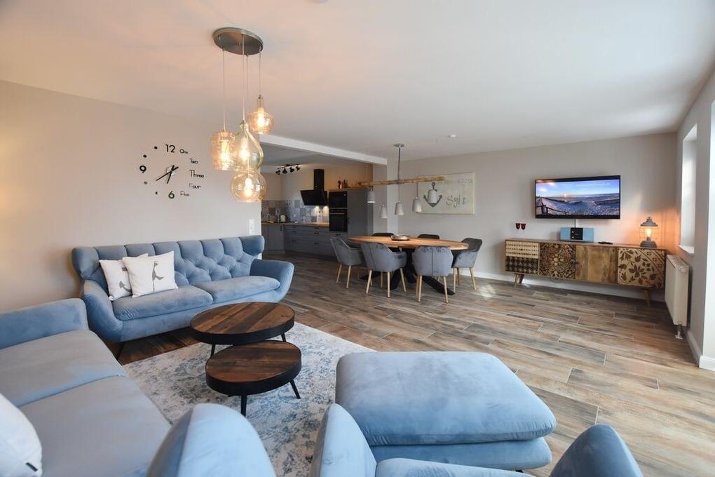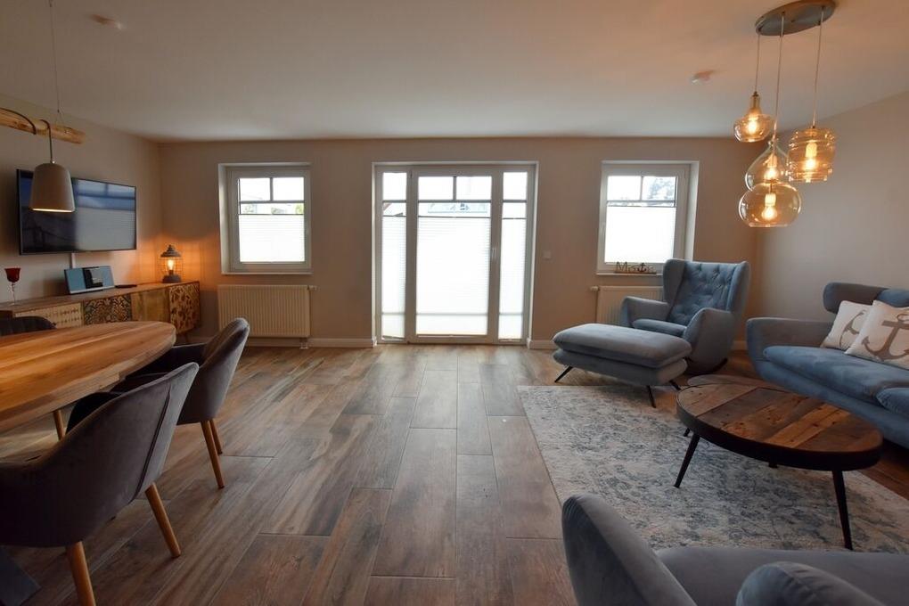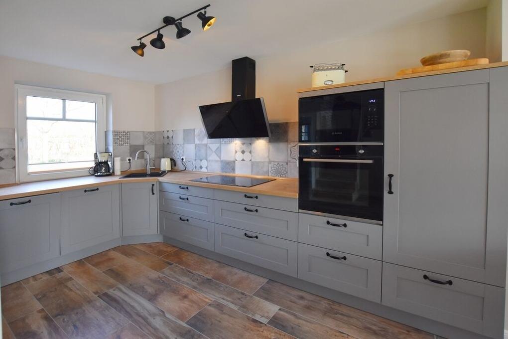 Im Wohnbereich wurden rustikale Holzfliesen verlegt, die das positive Gesamtbild des Ferienhauses abrunden. Die moderne Landhaus-Küche verfügt über ein großes 5 Platten, Induktionskochfeld, eine Microwelle, Geschirrspüler, Nespresso-Kapselmaschine und viele weitere Extras. Die Essecke, 2 Sofas, ein Schaukelsessel mit Fußhocker zum Relaxen und ein großes 50 Zoll Smart TV mit Kabel HD bieten bis zu 6 Personen genug Platz für einen erholsamen Urlaub im Ferienhaus Erika.[nbsp][nbsp]Ein modernes Duschbad ( Regendusche und Handbrause ) mit Fussbodenheizung, Waschbecken WC und ein kleiner Abstellraum gehören ebenfalls zur Ausstattung.