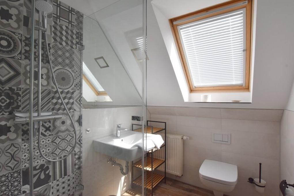 Zweites Badezimmer mit Regendusche und Handbrause , Waschbecken WC und kleiner Abstellraum.