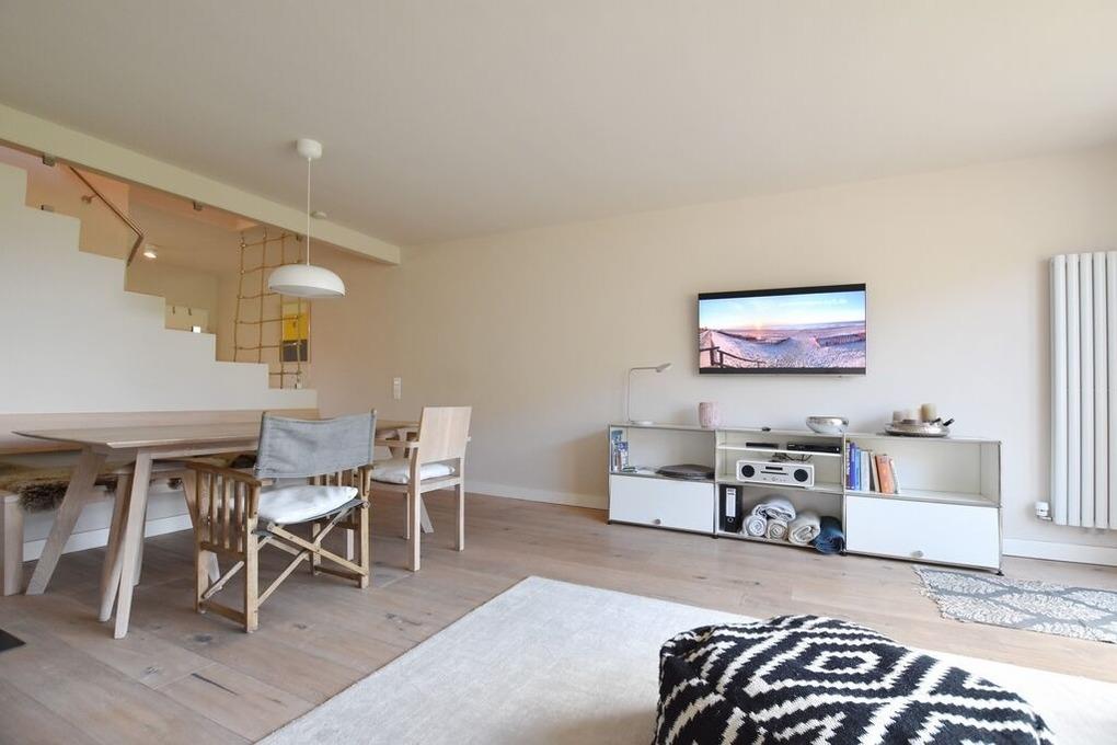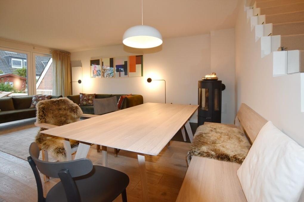 Der helle großzügige Wohn- und Essbereich mit Kaminofen sowie die offene moderne Küche bieten im Erdgeschoss viel Platz zum Entspannen, Essen und Kochen. Die Küchenausstattung lässt keine Wünsche offen. Für ruhige Abende stehen moderne Unterhaltungsmedien (u.a. mit Netflix und Disney+) zur Verfügung. Im Obergeschoss befinden sich zwei große Schlafzimmer und ein modernes Duschbad mit bodentiefer Regen-Dusche. Ein zusätzliches großes Zimmer mit Duschbad liegt im Dachgeschoss. Die stilvollen und liebevollen Einrichtungsdetails runden das positive Gesamtbild ab.