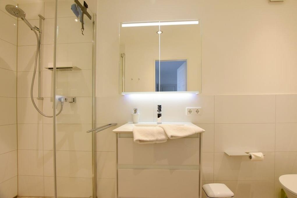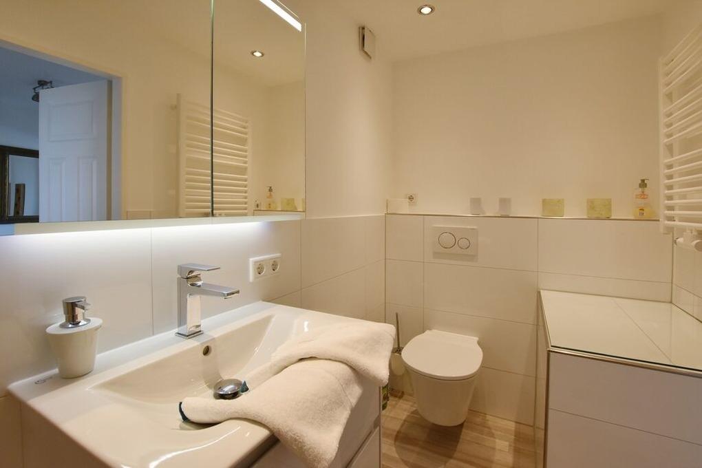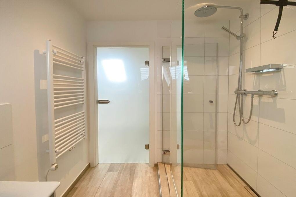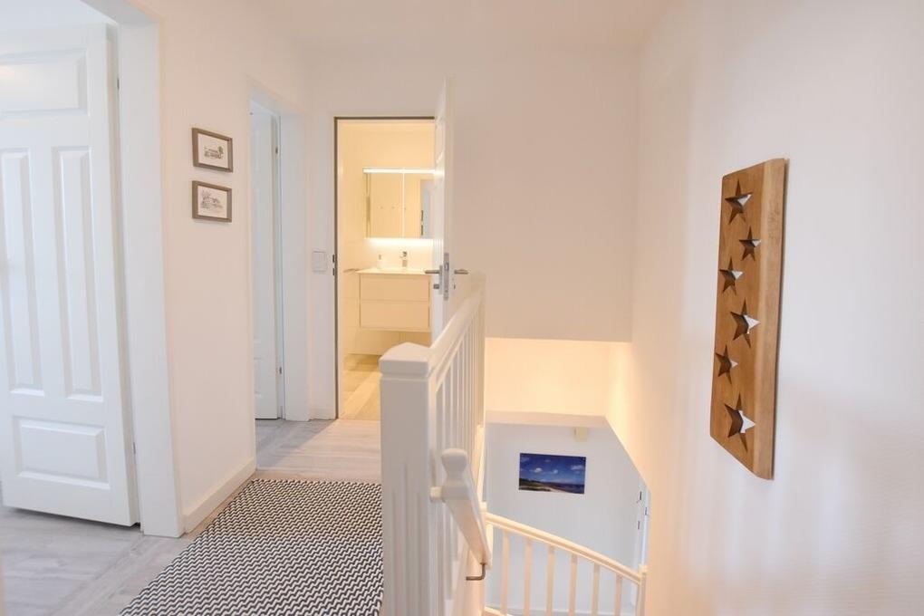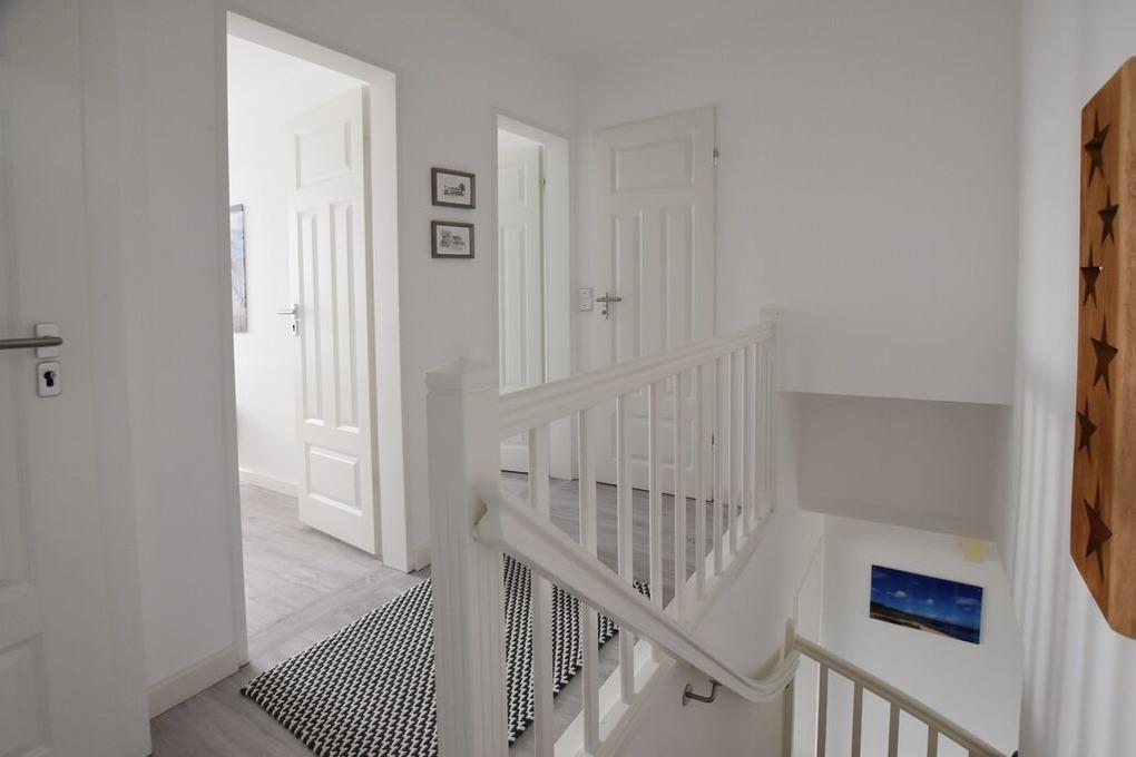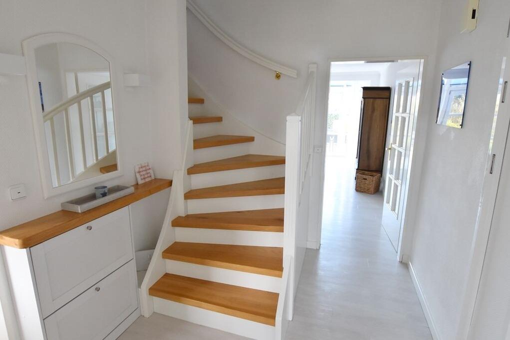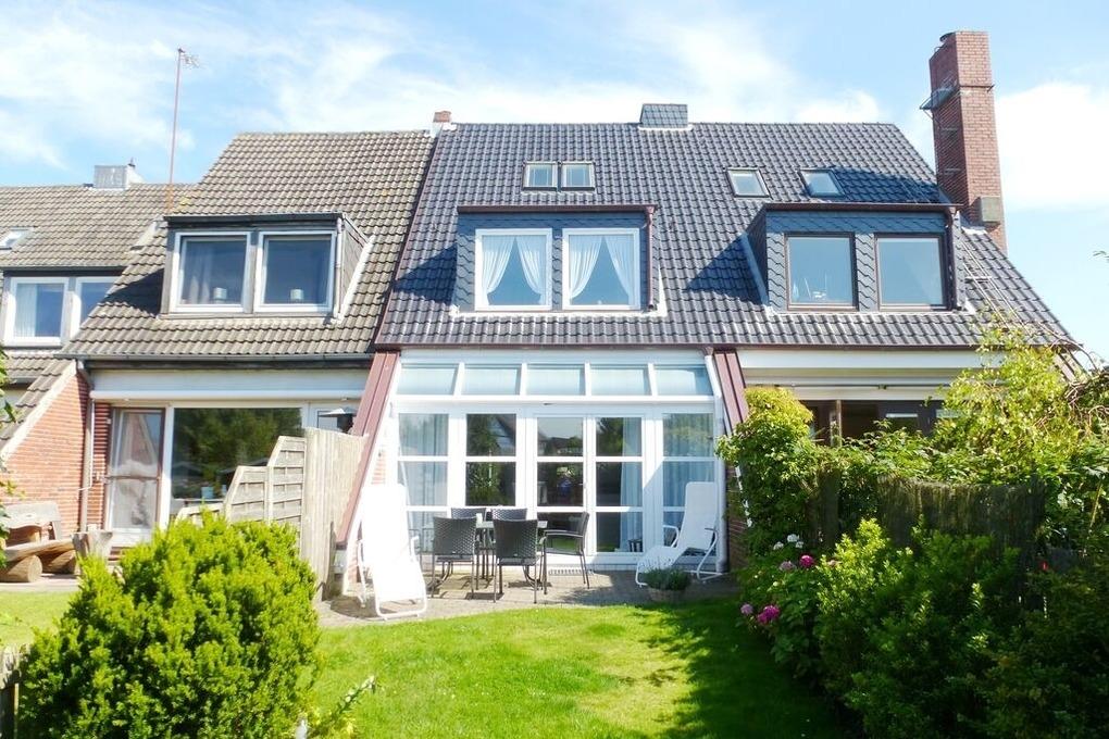 Reihenhaus mit Terrasse nach Süden, Wohnzimmer mit Wintergarten, gemütliche Eßecke und Fernseher, Sitzgruppe, Küche mit Geschirrspüler, Backofen, Mikrowelle, Waschmaschine und Trockner, 3 Schlafzimmer für je 2 Personen, neues Bad mit begehbarer Dusche, WC und Waschbecken, 1 Gäste- WC, im Spitzboden befindet sich ein zusätzlicher Raum mit Doppelbett und einem zweitem Duschbad mit WC.