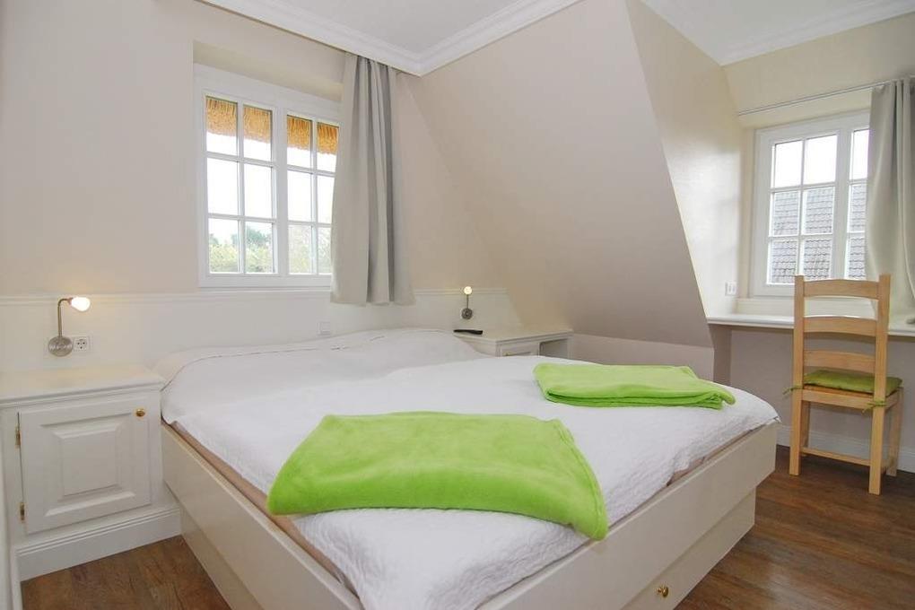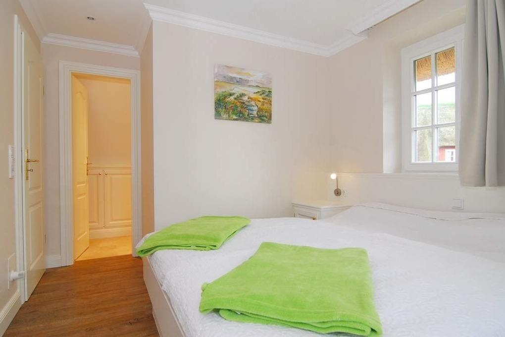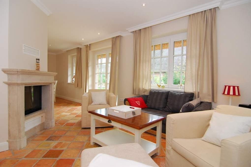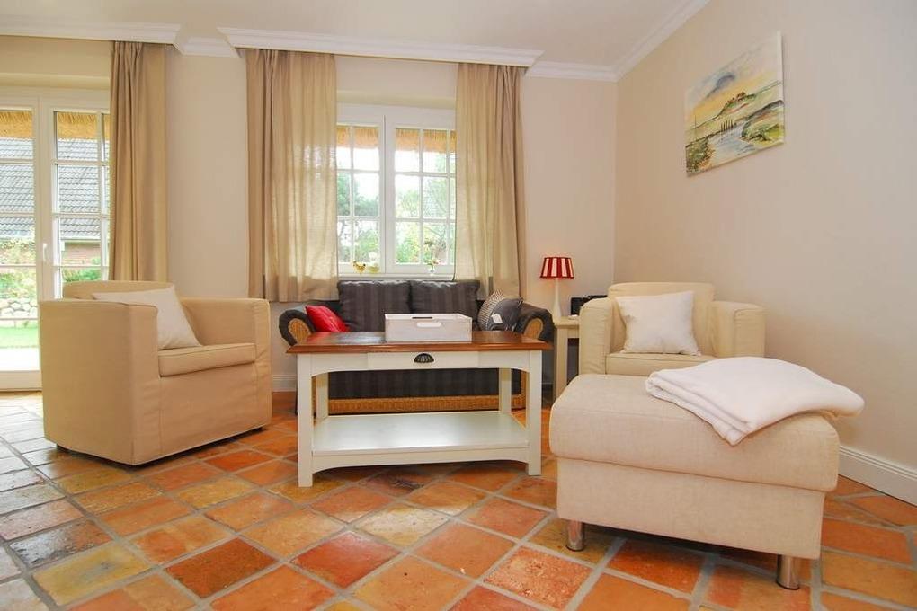 Schönes Ferienhaus / Doppelhaushälfte unter Reet auf sonnigem Südgrundstück. Ca. 113m². EG: gefliestes Wohn- und Esszimmer mit moderner Marken-Einbauküche (GS, Mikrowelle, etc.), schöner Essplatz am Fenster, Couchecke mit Doppelcouch, 2 Sesseln und Hocker, Kamin, WLan, Flat-Screen, Stereoanlage mit CD, Gäste-WC, HW-Raum mit WA/TR, Garderobe. OG: 1 Schlafzimmer mit Doppelbett, Flat-Screen und eigenem Duschbad/WC, 1 weiteres Schlafzimmer mit Doppelbett und Flatscreen sowie 1 Schlafzimmer mit 1,20x2m und Flat-Screen, 1 Vollbad/WC. Zusätzlicher Schrank-/Abstellraum im DG. Große Süd- und Ostterrasse mit Gartenmöbeln. Nichtraucher-Haus! Grillen verboten!!! Bettwäsche und Handtücher sind zur Anreise aufgezogen. Tierhaltung ist erlaubt, muss bitte angemeldet werden!