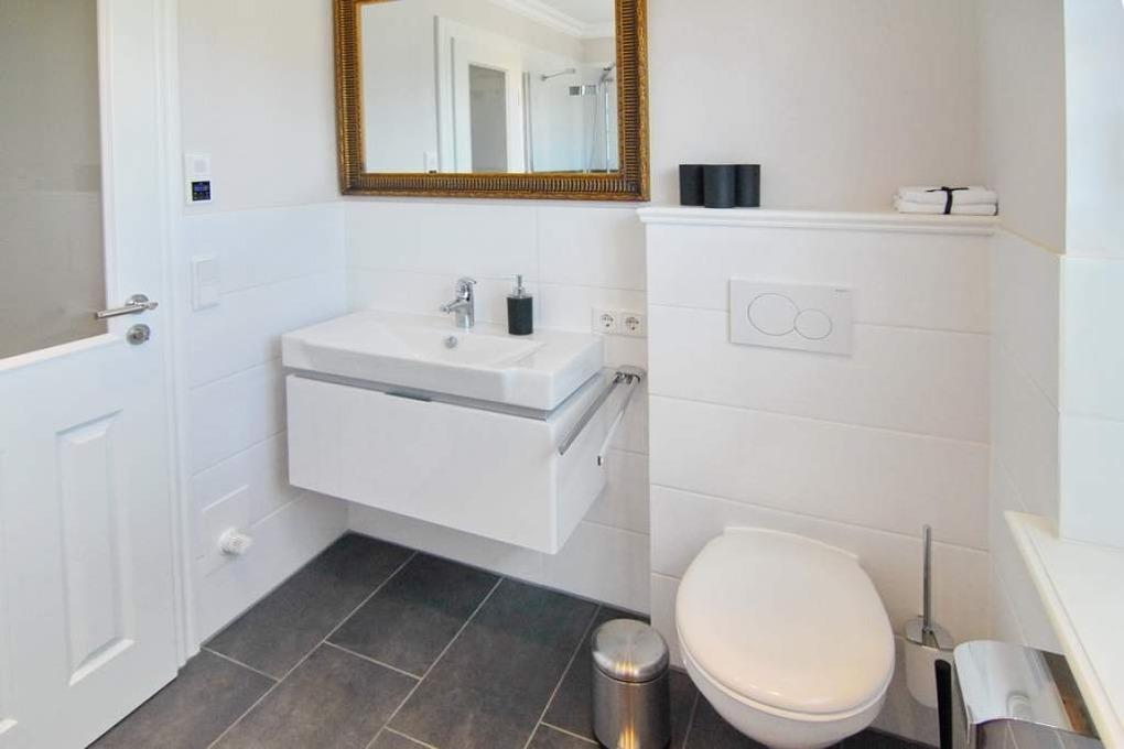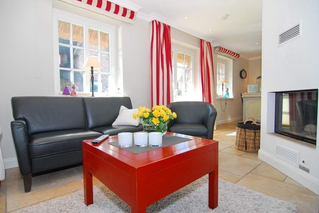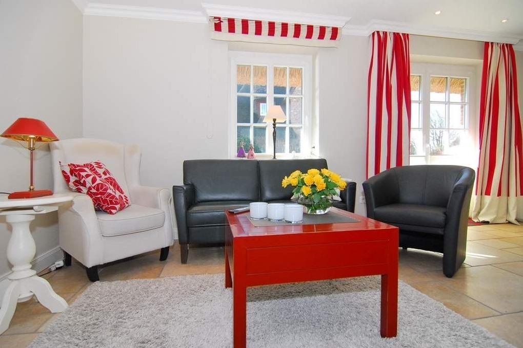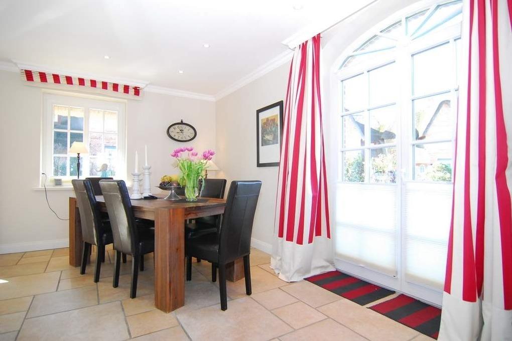 Exklusive Ferienhaushälfte im Ortskern von Tinnum mit Süd-Terrasse unter Reet, ca. 113m². EG: gefliestes Wohnzimmer mit Essplatz, Kamin und Couchecke, Flat-TV,[nbsp][nbsp]WLAN (ohne Gewähr), Terrasse mit Gartenmöbeln, offene Küche mit Geschirrspüler, Mikrowelle und Backofen, Gäste-WC, HW-Raum mit Waschmaschine und Trockner. OG: 2 Schlafzimmer mit Doppelbetten, 1 Schlafzimmer mit Einzelbett, 2 Duschbäder/WC. PKW-Stellplatz am Haus. Tierhaltung und grillen verboten. Nichtraucher-Haus!!! Bettwäsche und Handtücher sind zur Anreise aufgezogen.