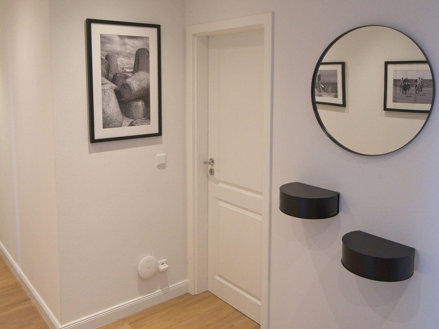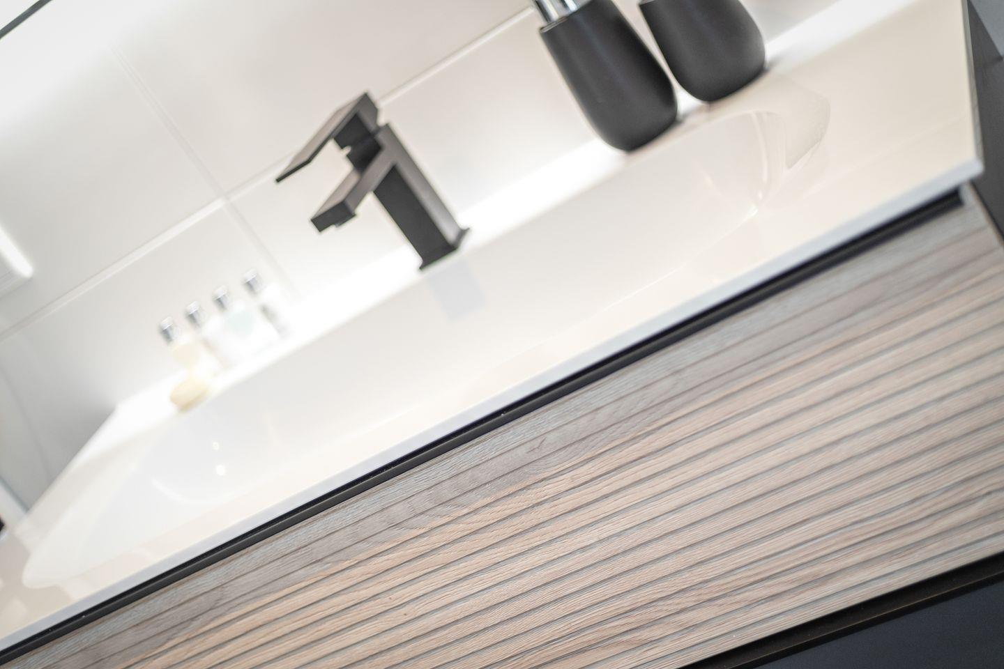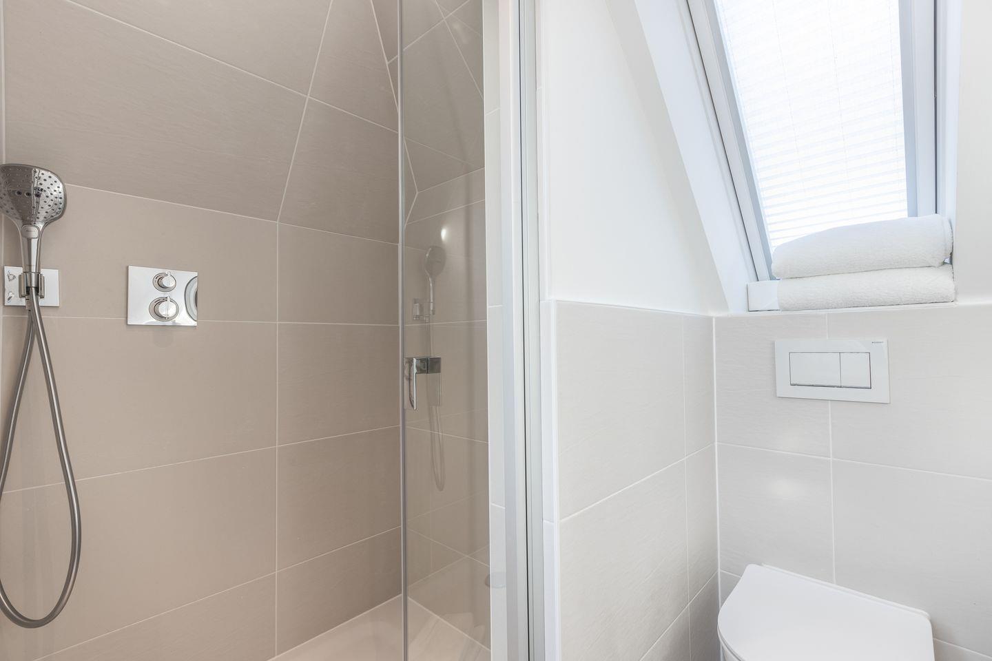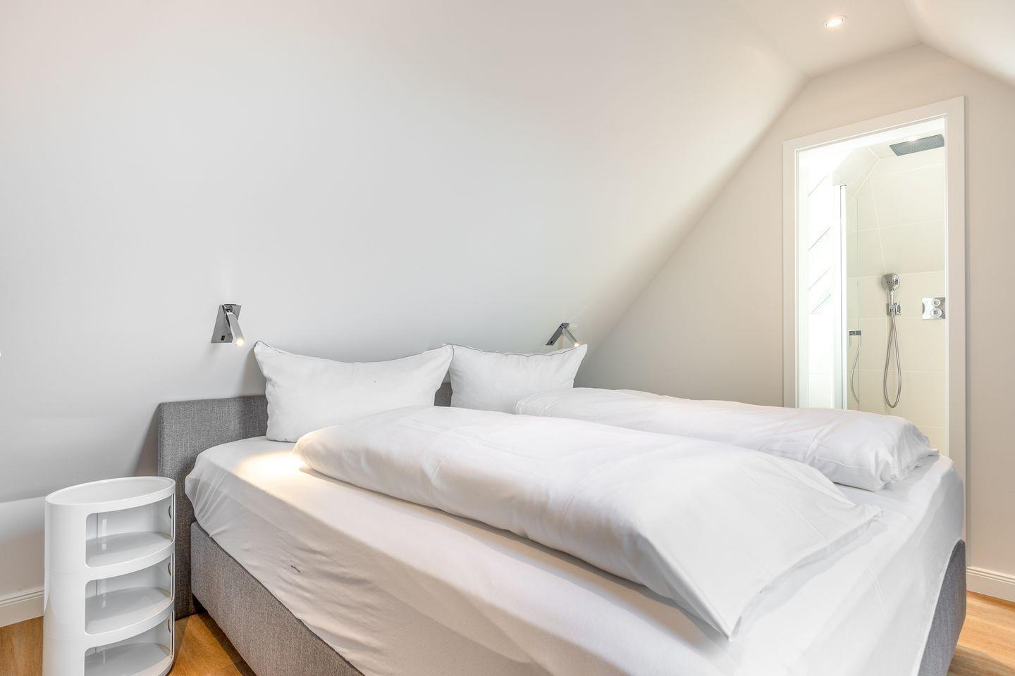 Auf gleicher Ebene wie der Wohnbereich befinden sich ein Schlafzimmer mit traumhaftem Doppel-Boxspringbett und keinem Schreibtisch sowie ein kleineres Schlafzimmer mit einem Einzel-Boxspringbett. Für das nötige "Wellness-Feeling" sorgt das großzügige Bad nebst Badewanne und Dusche und nicht zu vergessen - ein Gäste-WC, das allein schon durch seine stylische Tapete ein echter Hingucker ist.