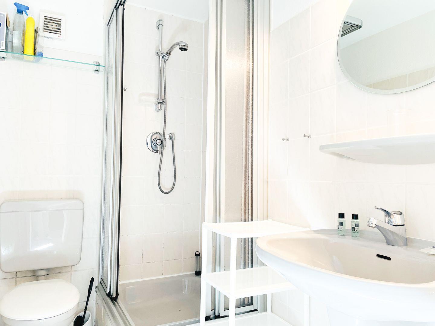Das Bad verfügt über Dusche, Waschbecken und WC.