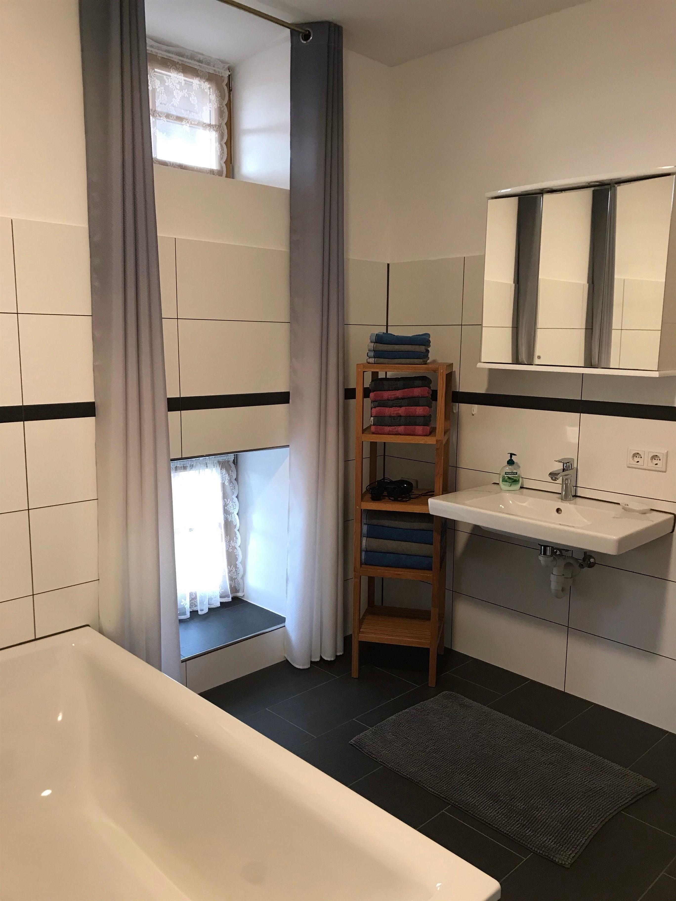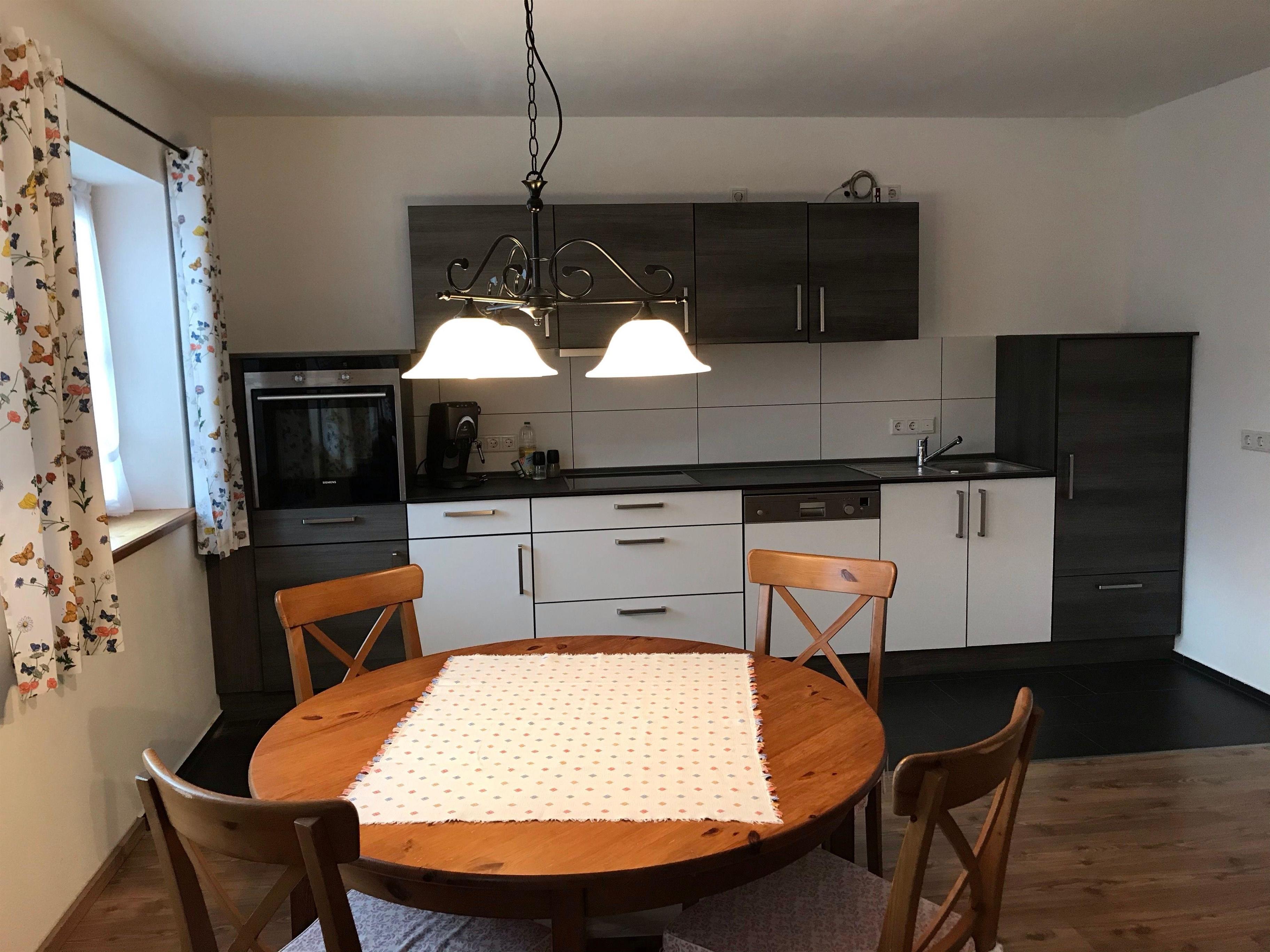 Die ruhige, gemütliche Nichtraucherferienwohnung im 1. Stock, ist ausgestattet mit einer Wohnküche mit kompletter Einbauküche, Wohnzimmer mit Schlafcouch, einem Schlafzimmer mit Doppelbett und einem großzügigen Bad mit großer Dusche und Badewanne.