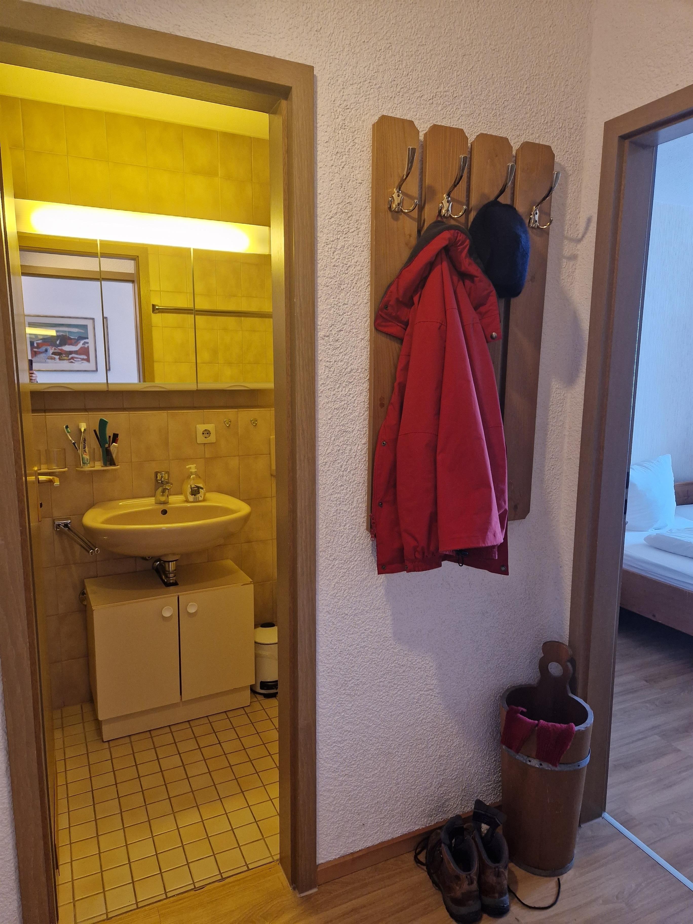 Das kleine Badezimmer ist gepflegt und hat eine Dusche, Waschbecken und WC.