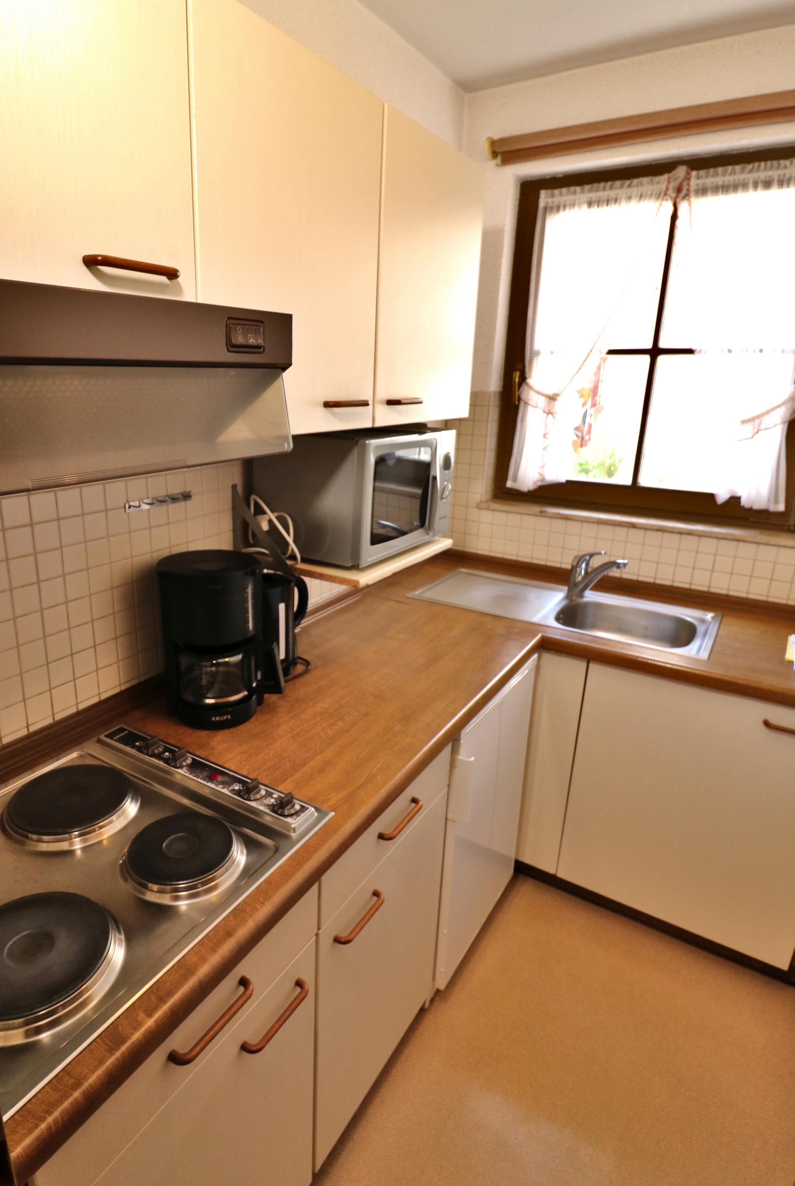 - Küche mit Herd, Kühlschrank mit Gefrierfach, Mikrowelle, Toaster, Wasserkocher und Küchengrundausstattung