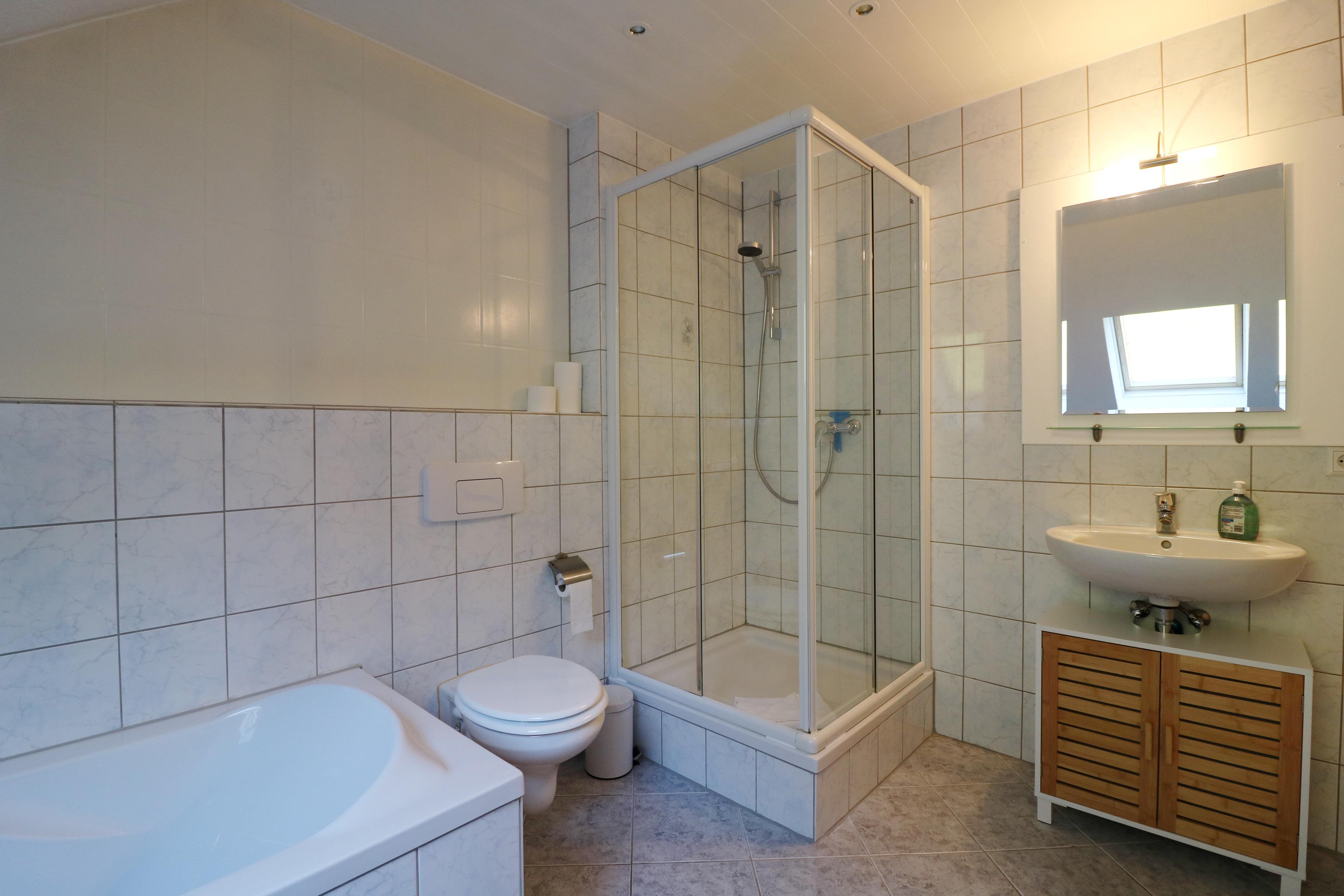 - Ein Badezimmer mit WC, Dusche und Badewanne