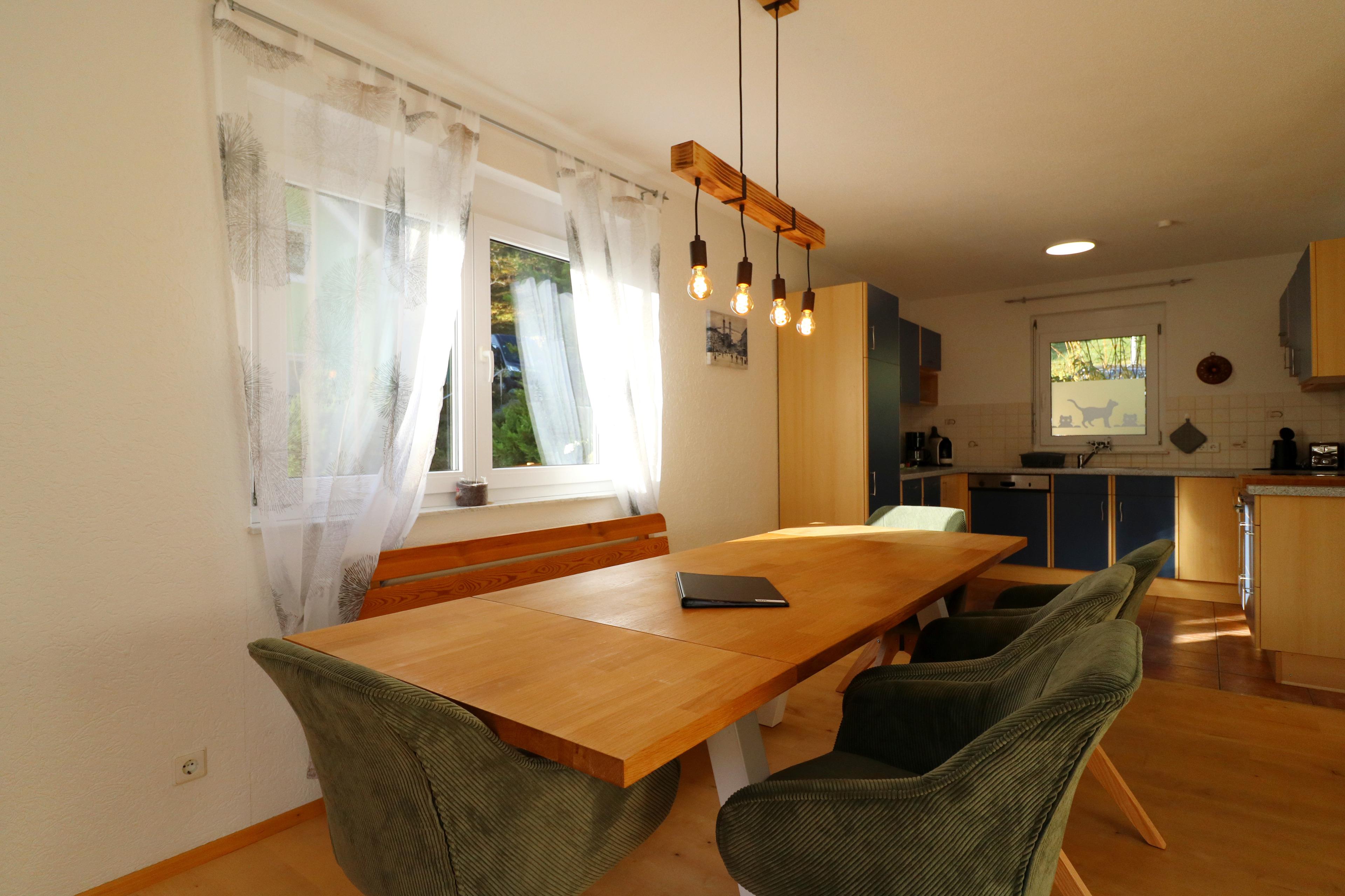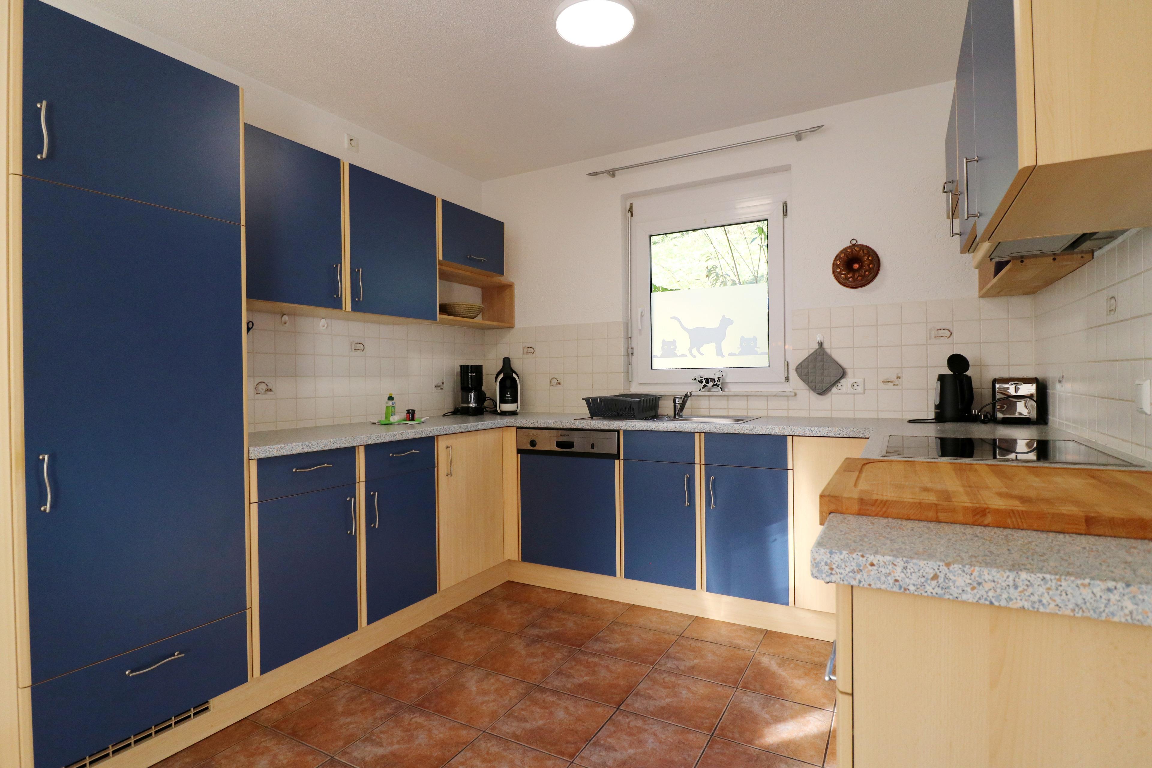 - Eine vollausgestatte Küche mit Cafissimo-Kapsel-Kaffeemaschine, Filterkaffeemaschine, Kühlschrank mit Gefrierfach, Geschirrspüler, Herd mit 4 Kochfeldern, Toaster, Backofen, Wasserkocher, Küchengrundausstattung und gemütlichem Esszimmer