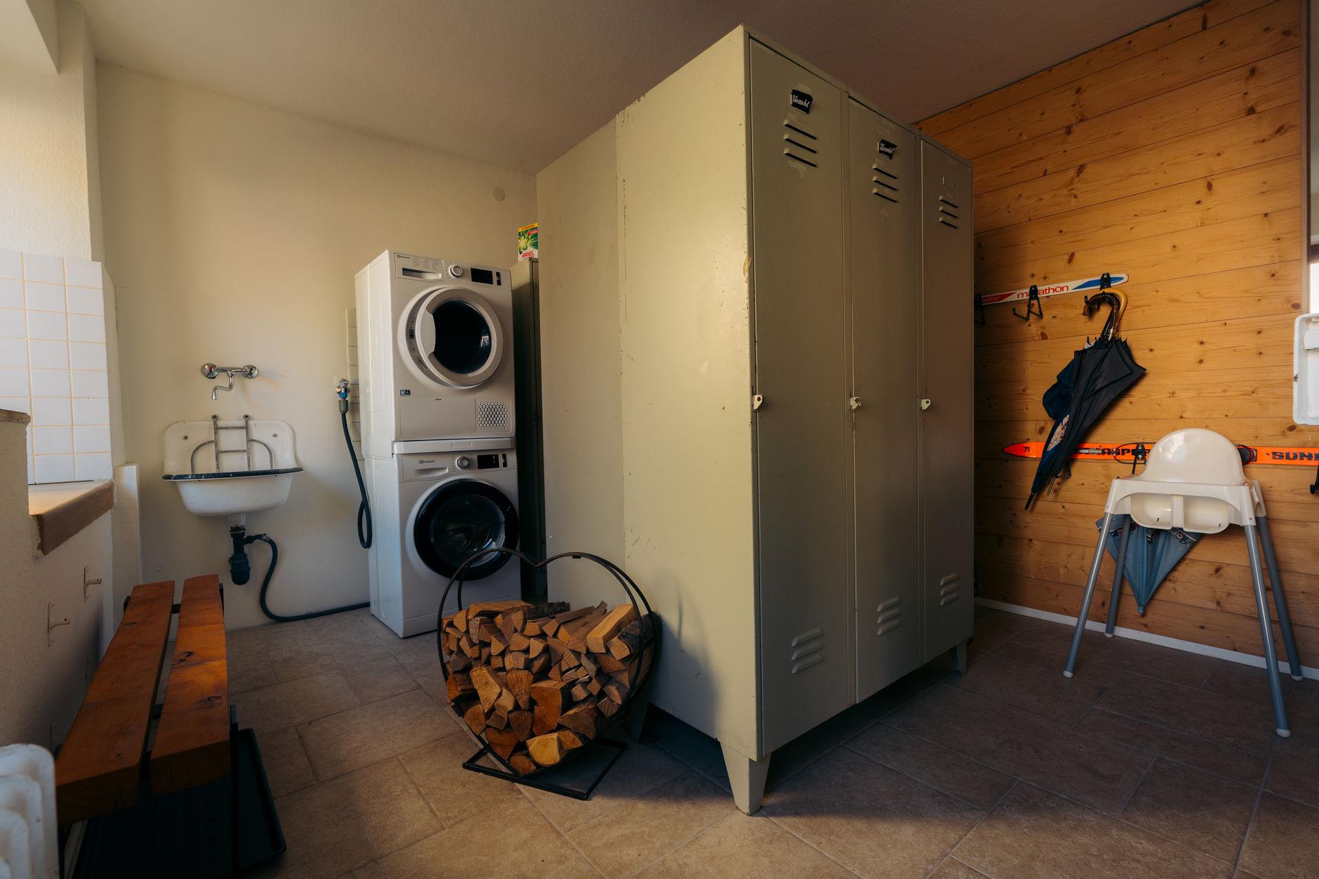 Im Erdgeschoss befindet sich eine weitere Ferienwohnung für 6 Personen. Gerne kann das Haus auch als Gruppe für 16 Personen gebucht werden. Ein gemeinschaftlicher Skiraum mit Waschmaschine und Trockner ist vorhanden.