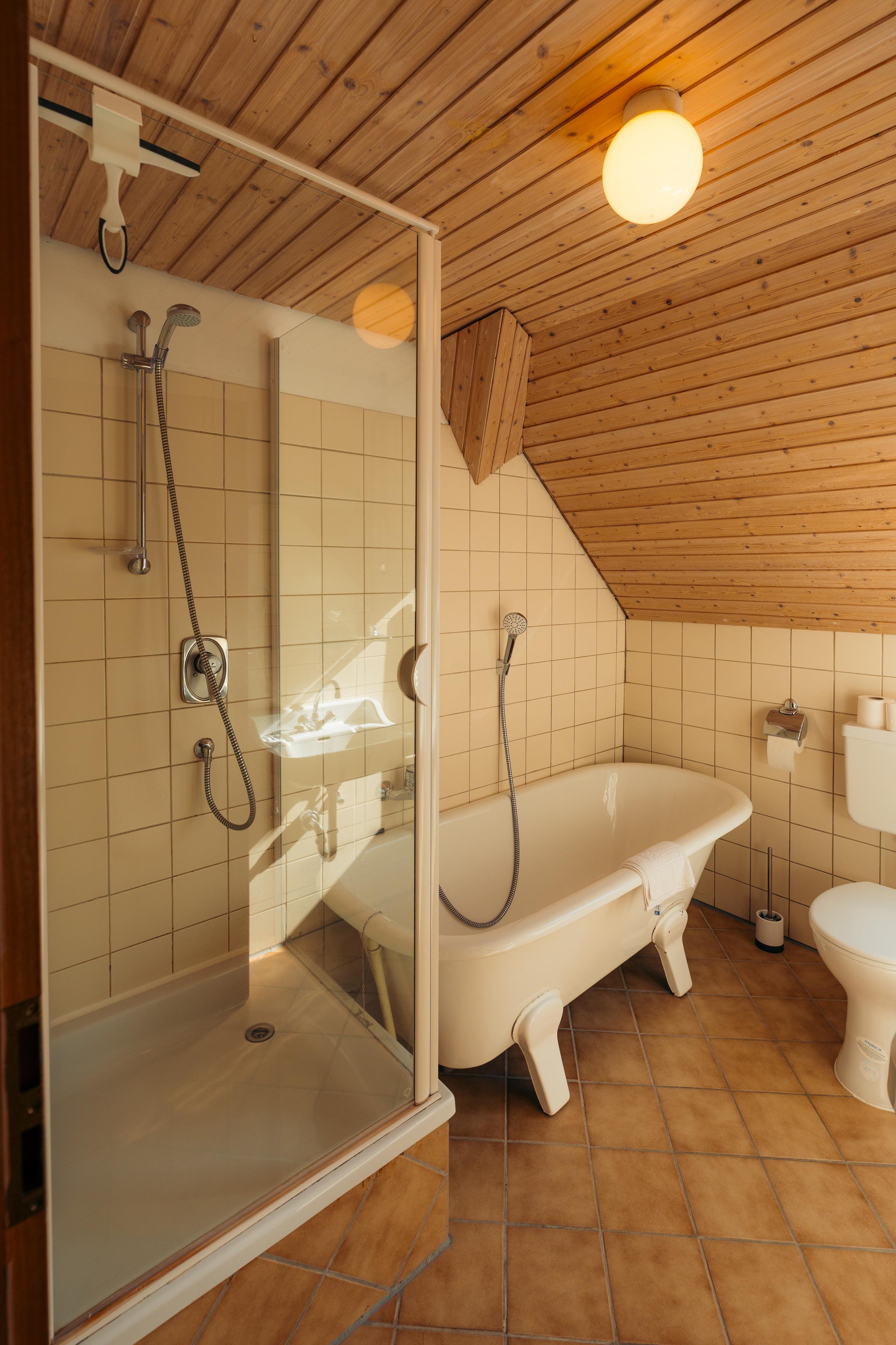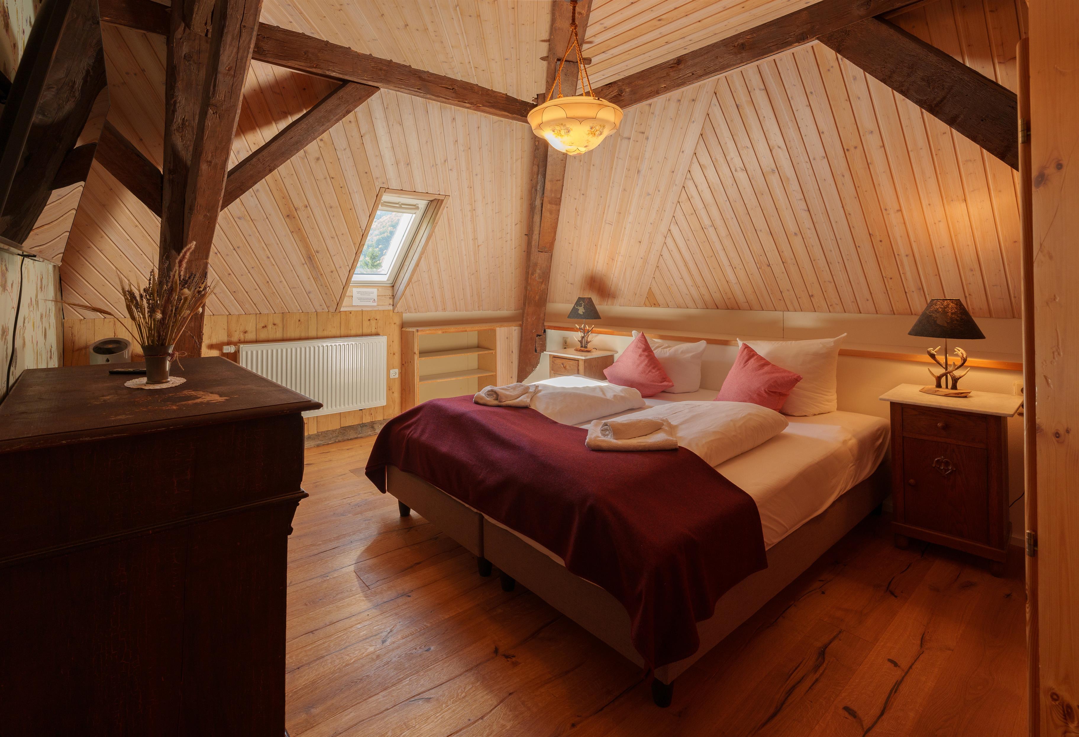 The apartment extends over two floors on the 1st floor and DG and is connected by a wooden staircase. There are two bedrooms and a spacious bathroom with shower on the second floor. Here is also the sauna. As well as two more bedrooms with private bathroom with shower and bathtub under the cozy wood-paneled sloping roof in the attic. Each bedroom is equipped with smart TV.