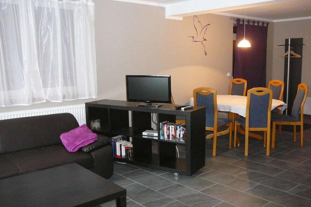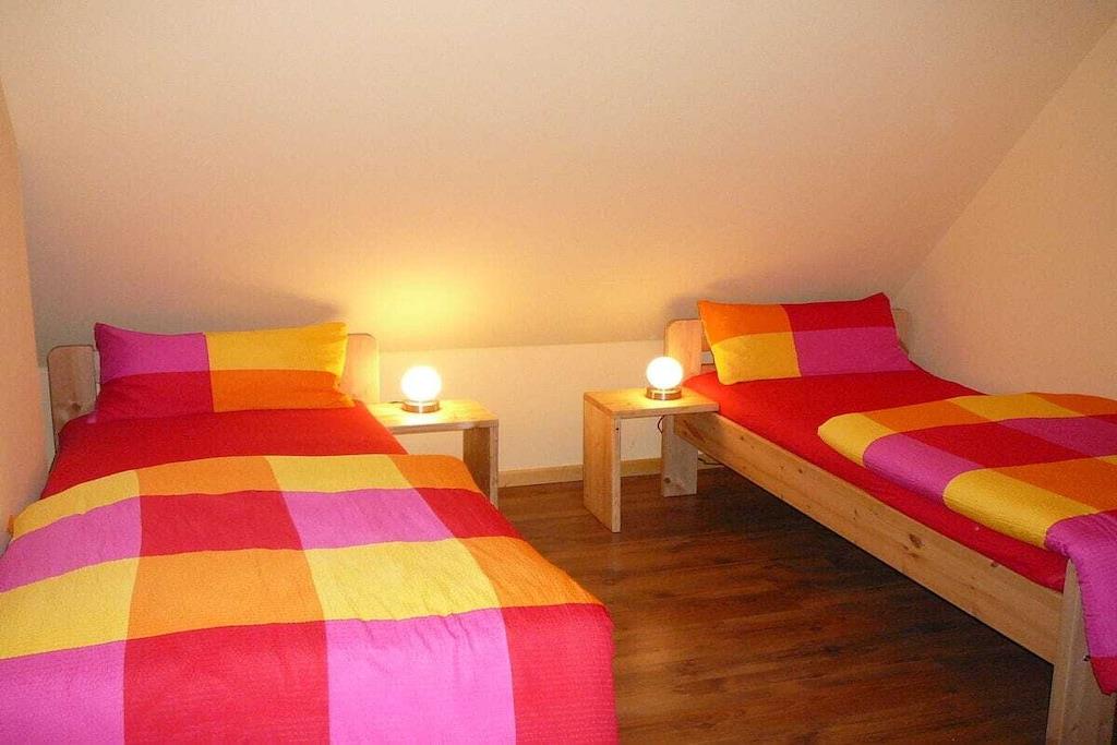 Stueetage: (stue / spisestue(, , , , bibliotek, Græsplæne, Fjernsyn, spisebord, DVD-afspiller, radio, CD-afspiller, stereoanlæg, kogeplade, elkedel, brødrister, kaffemaskine, ovn, grill, mikrobølgeovn, opvaskemaskine , køleskab), badeværelse(, toilet, badekar, bruser, håndvask, varme)) På 1. etage: (soveværelse(, enkeltseng, enkeltseng), soveværelse(, dobbeltseng), guest toilet(, toilet, håndvask)) , , , Internetadgang, vaskemaskine, varme, terrasse(, , Græsplæne, grill, havemøbler, solstole, dart), have(Græsplæne), parkering, trappegitter, tørreskab