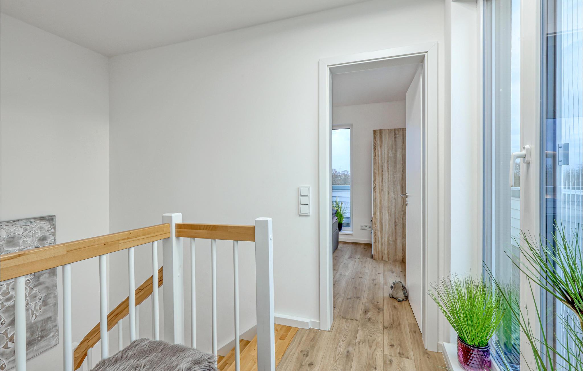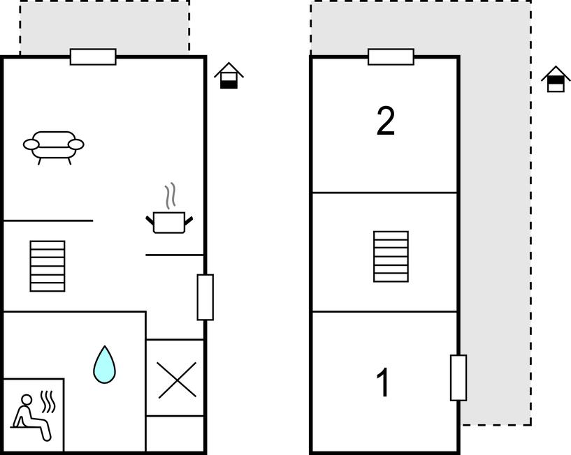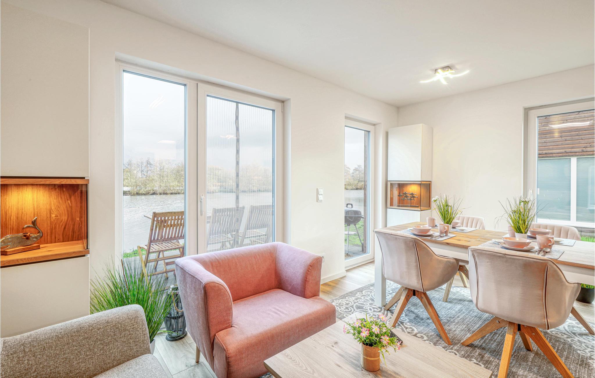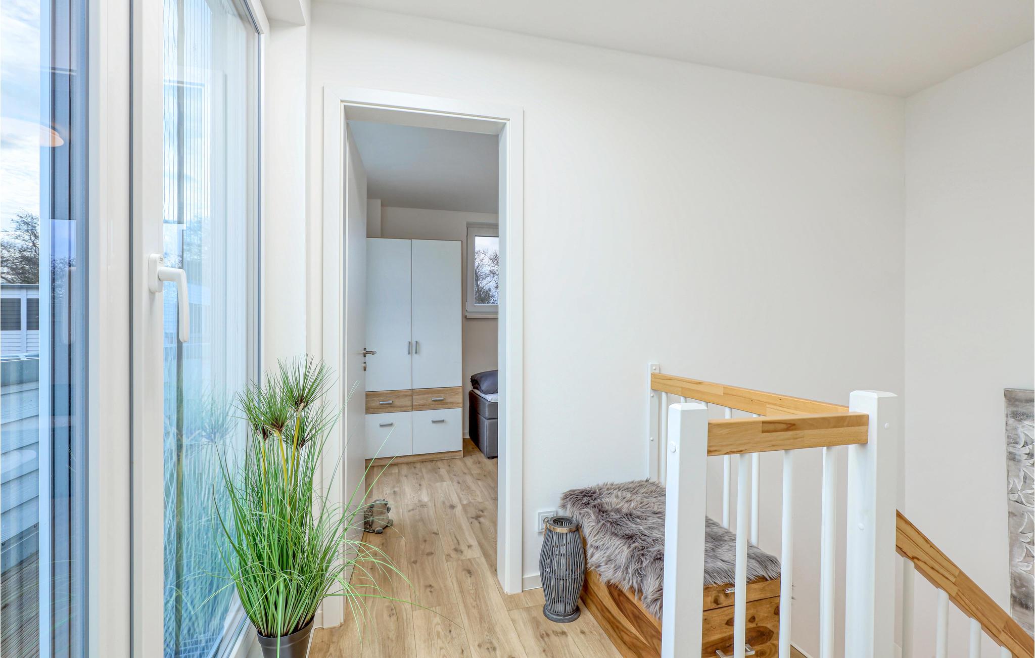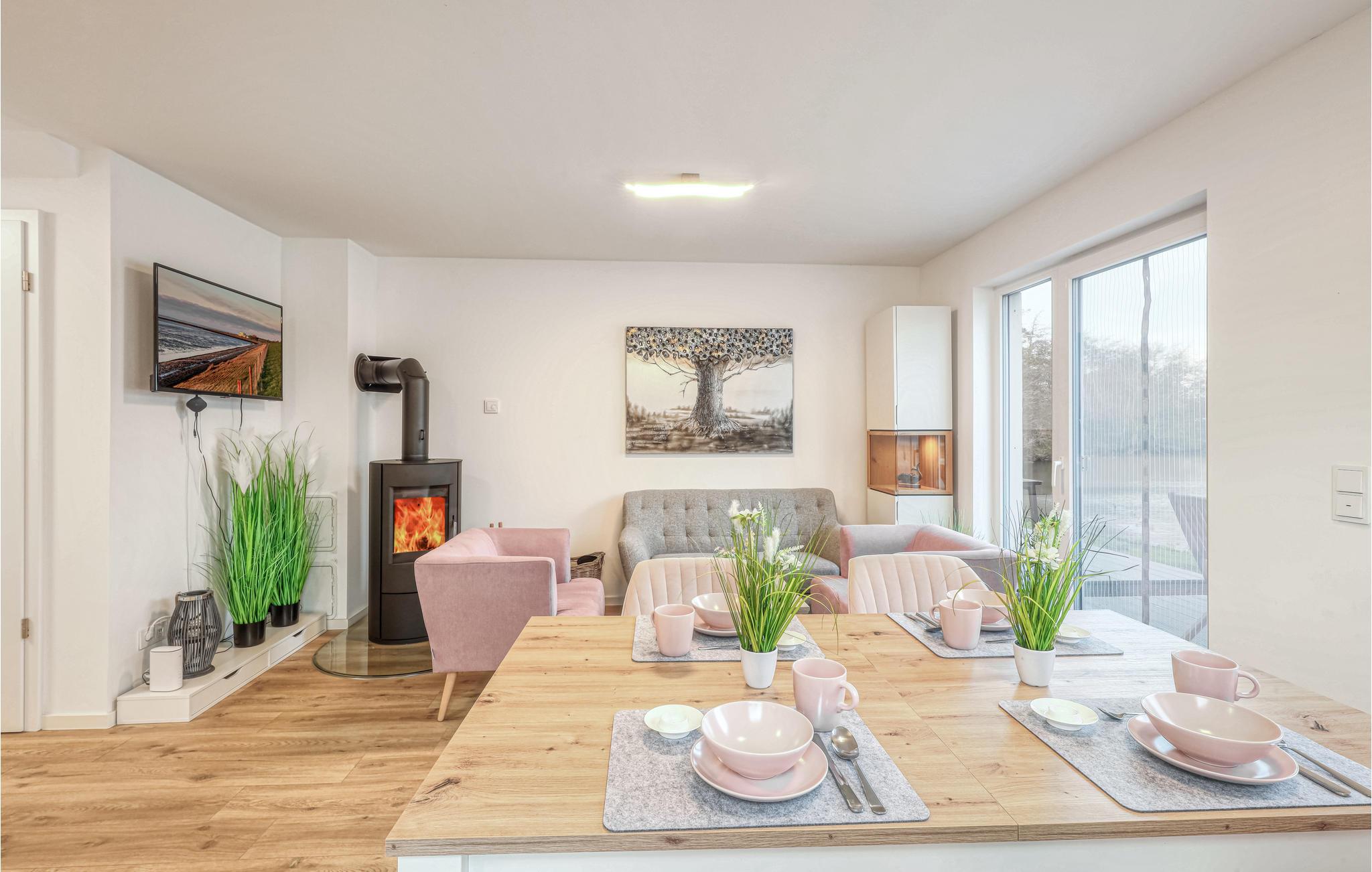 Ferieboligen udgør den ene halvdel af et dobbelthus og fordeler sig over to etager. I stueetagen er der et åbent, hyggeligt opholdsområde med tilstødende haveterrasse og et moderne køkken, som med høje vinduer udgør et lyst og behageligt rum. På kolde dage kan I sætte jer til rette foran brændeovnen. Ved siden af opholdsstuen er der et lyst badeværelse med brusekabine og infrarød sauna.