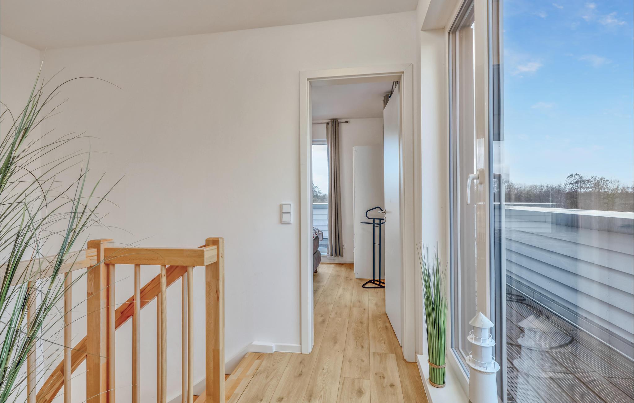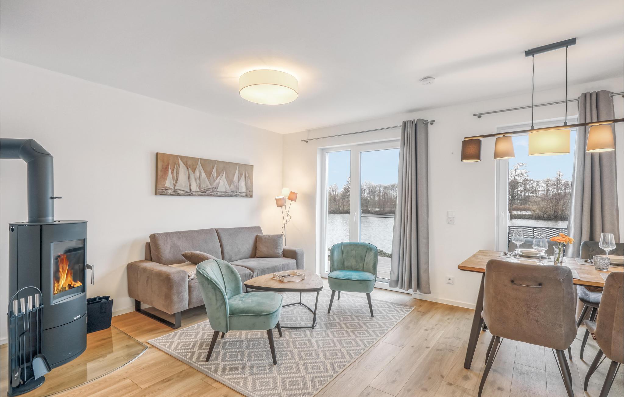 Ferieboligen udgør den ene halvdel af et dobbelthus og fordeler sig over to etager. I stueetagen er der et åbent, hyggeligt opholdsområde med tilstødende haveterrasse og et moderne køkken, som med høje vinduer udgør et lyst og behageligt rum. På kolde dage kan I sætte jer til rette foran brændeovnen. Ved siden af opholdsstuen er der et lyst badeværelse med brusekabine og infrarød sauna.