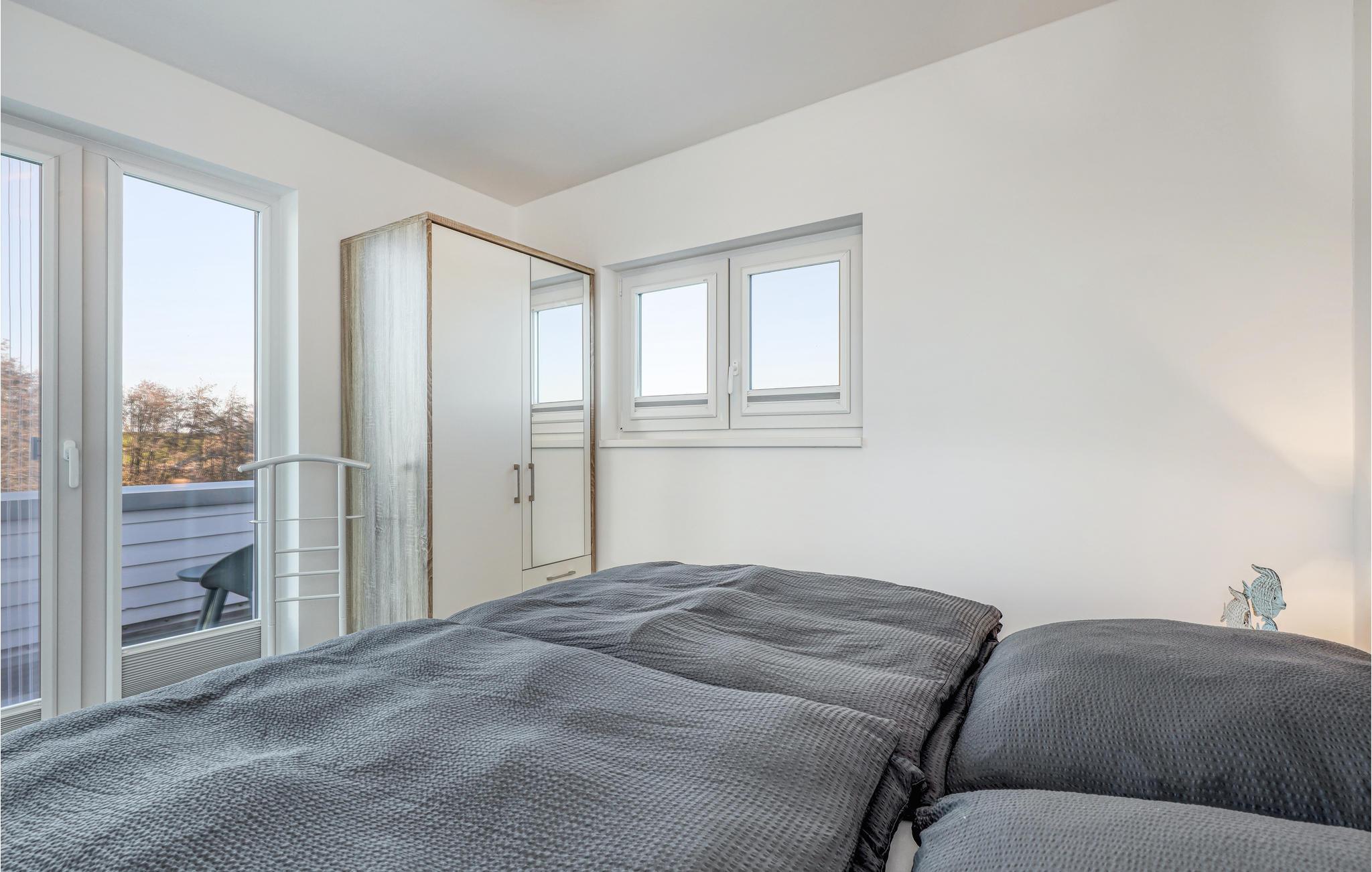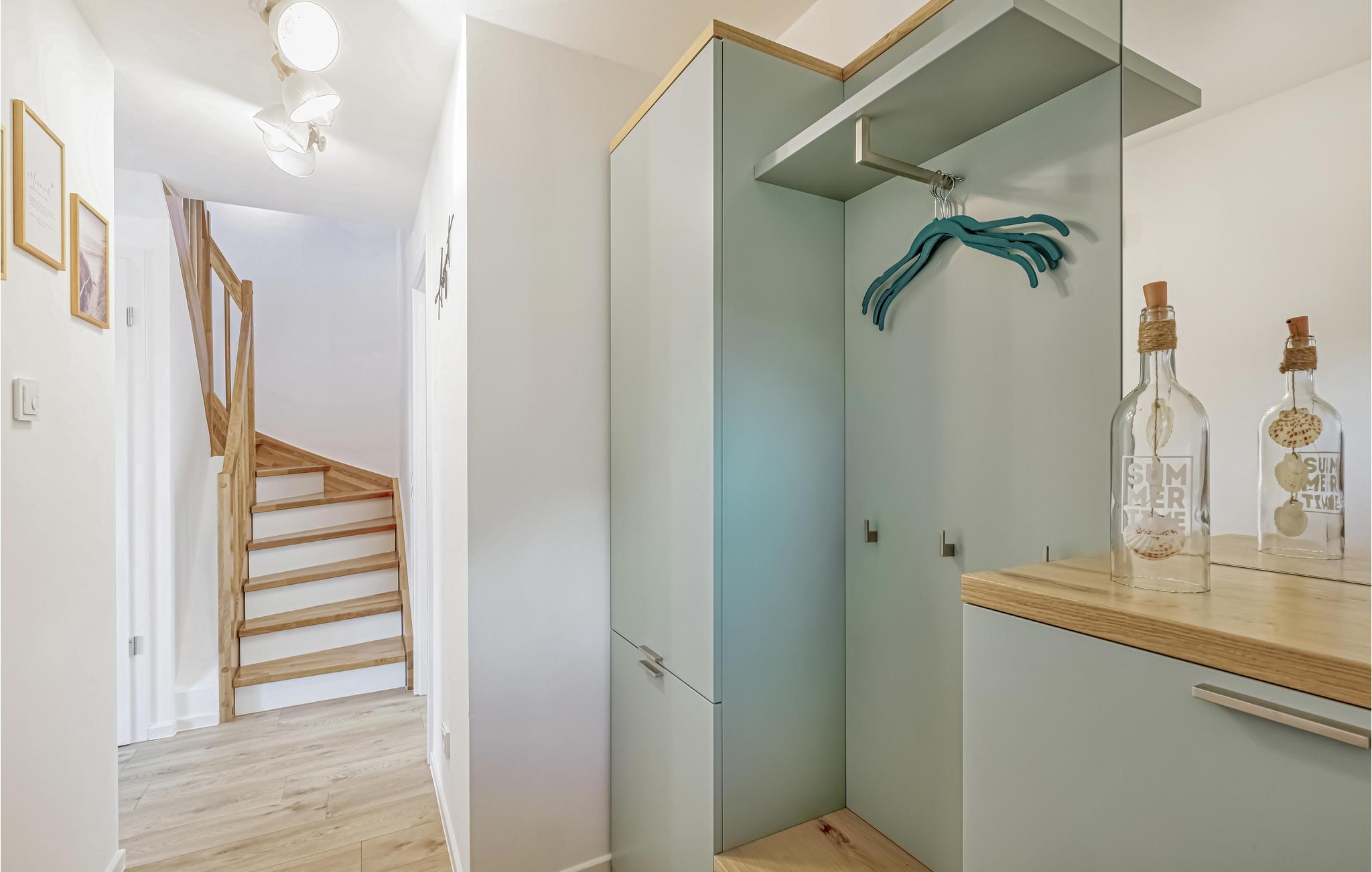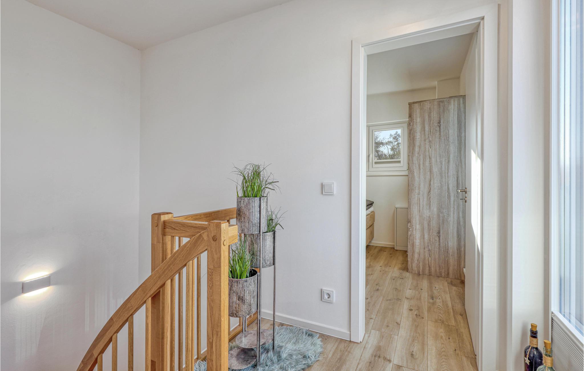 Fra stueetagen fører en buet trappe op til den øverste etage i dobbelthuset, hvor to rummelige soveværelser venter på jer. Her kan I nyde den friske Vesterhavsluft fra en altan, som er tilgængelig fra begge værelser. Møbler af høj kvalitet og en vellykket ruminddeling gør dette feriehus til et drømmehus.