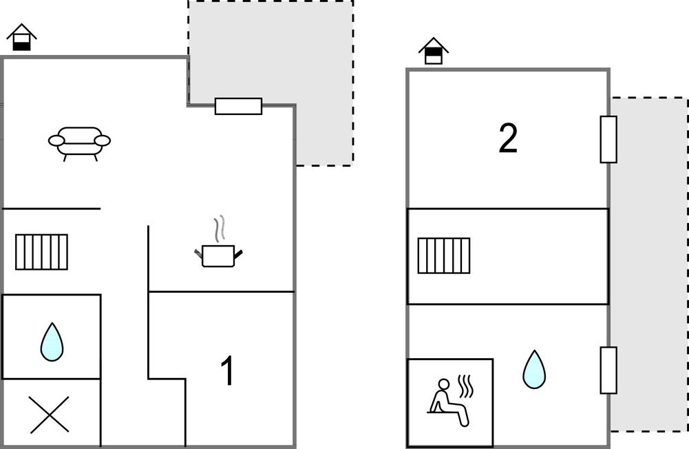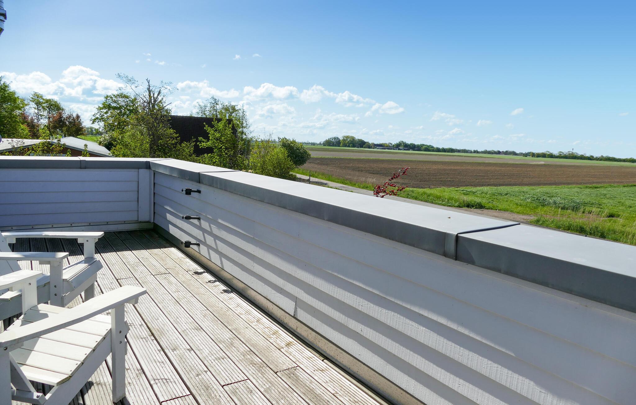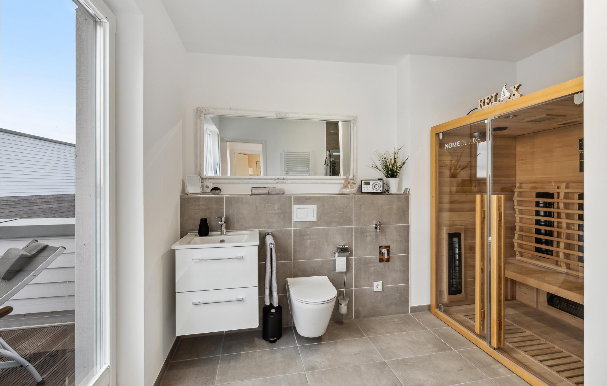 Et badeværelse og et soveværelse ligger langs gangen på begge sider, og en trappe bag badeværelset fører til øverste etage. Der er soveværelse og badeværelse med brusekabine og infrarød sauna, hvor I kan hvile stængerne efter en aktiv feriedag. Nyd den skønne luft fra Nordsøen fra en altan, som er tilgængelig fra begge værelser. De komfortable møbler og den gennemtænkte indretning gør dette hus til et drømmehus.