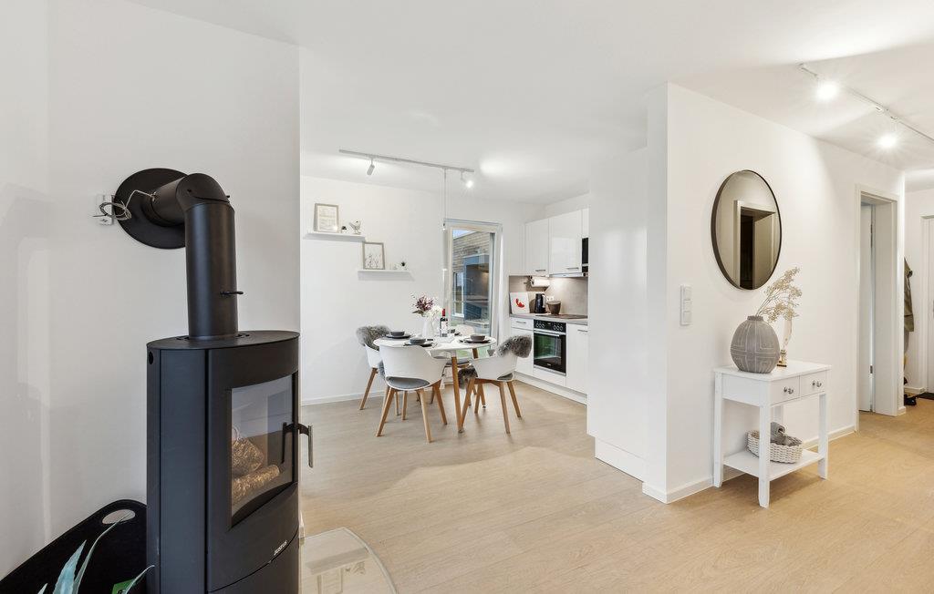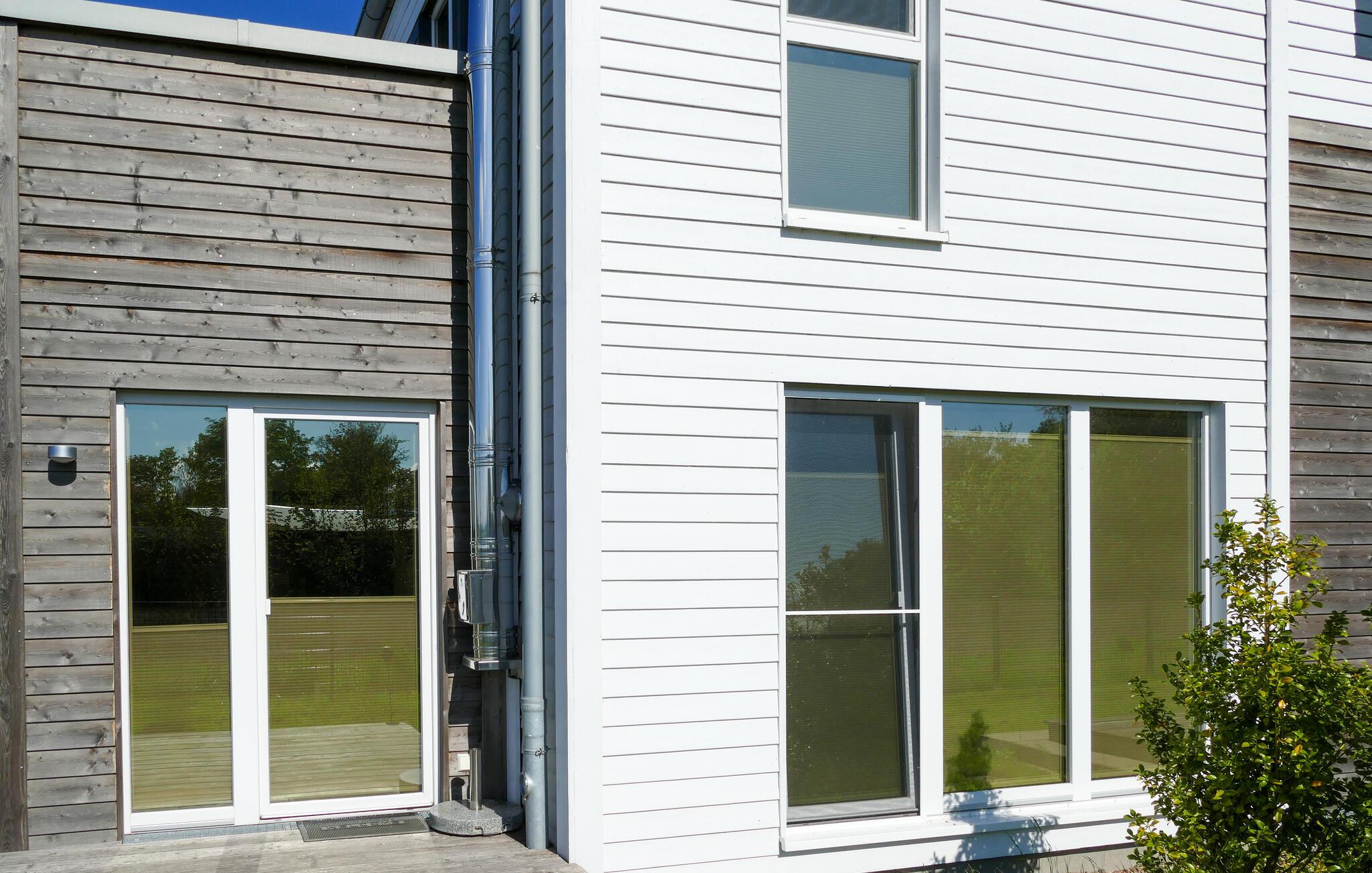 Huset fordeler sig over to etager. I stueetagen er der en åben, hyggelig opholdsstue med en tilstødende haveterrasse og et moderne udstyret køkken med udsigt gennem vinduerne fra gulv til loft. På kolde dage kan I finde jer godt tilpas foran den indbyggede pejs.