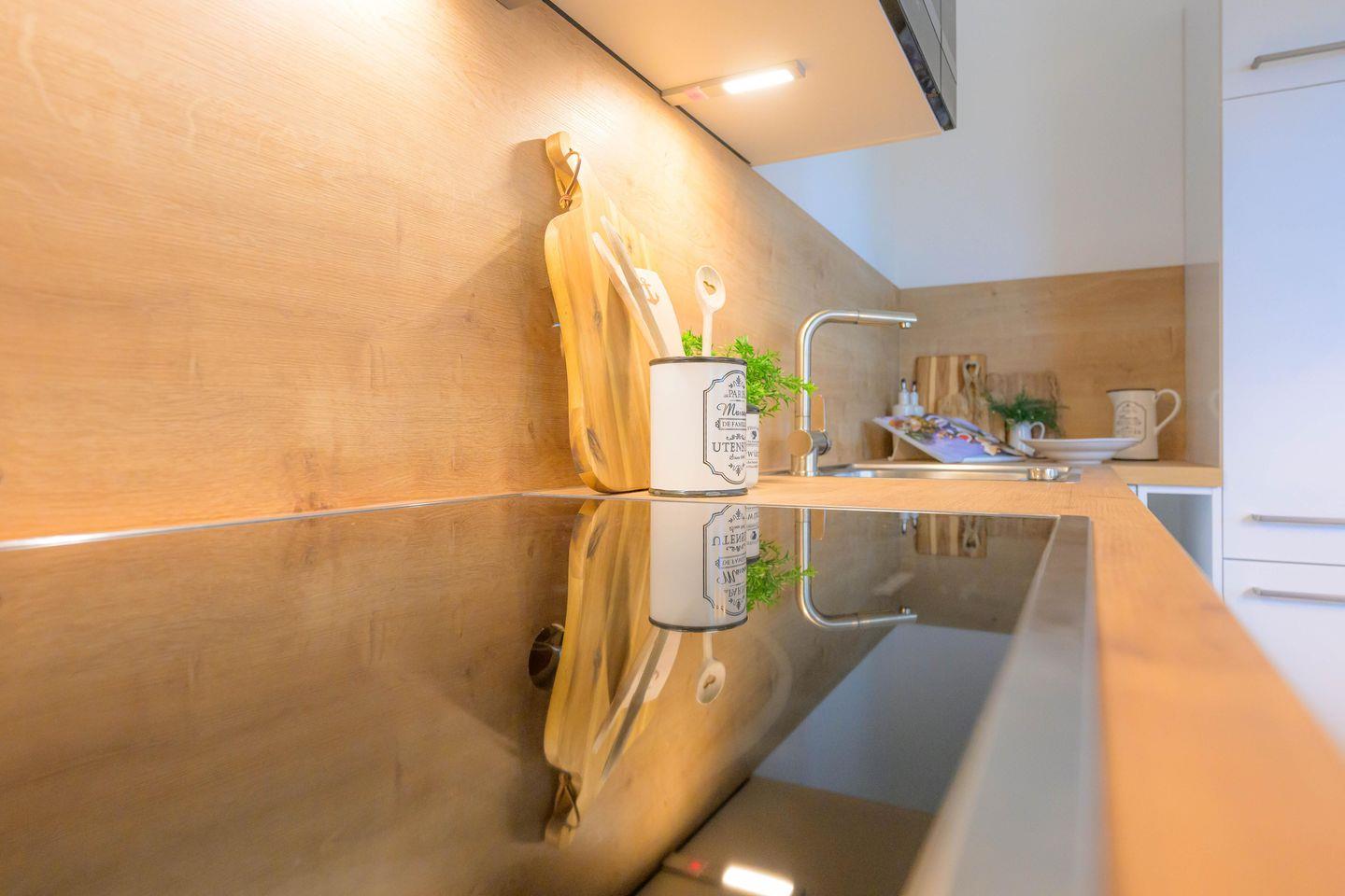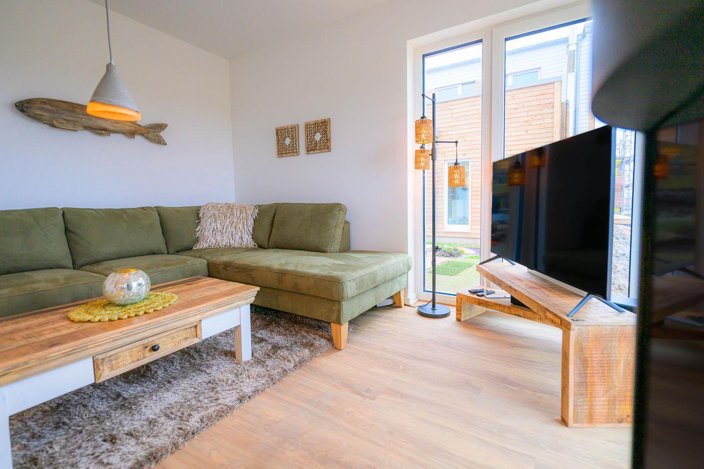 Im lichtdurchfluteten Wohnbereich mit bodentiefen Fenstern, Holzofenkamin und großem Smart-TV kannst du es dir richtig gemütlich machen. Die offene, voll ausgestattete Küche mit Essbereich lädt zum gemeinsamen Kochen ein. Von hier aus hast du direkten Zugang zur möblierten Terrasse und zum Garten mit Weber-Kohlegrill.