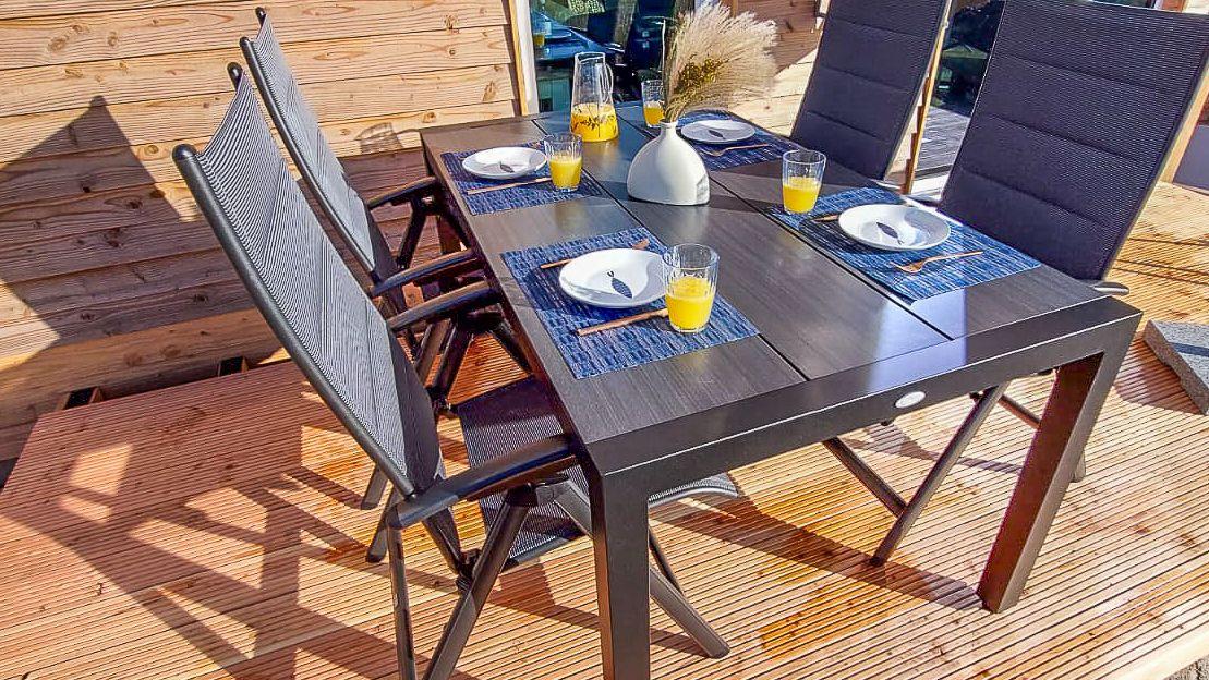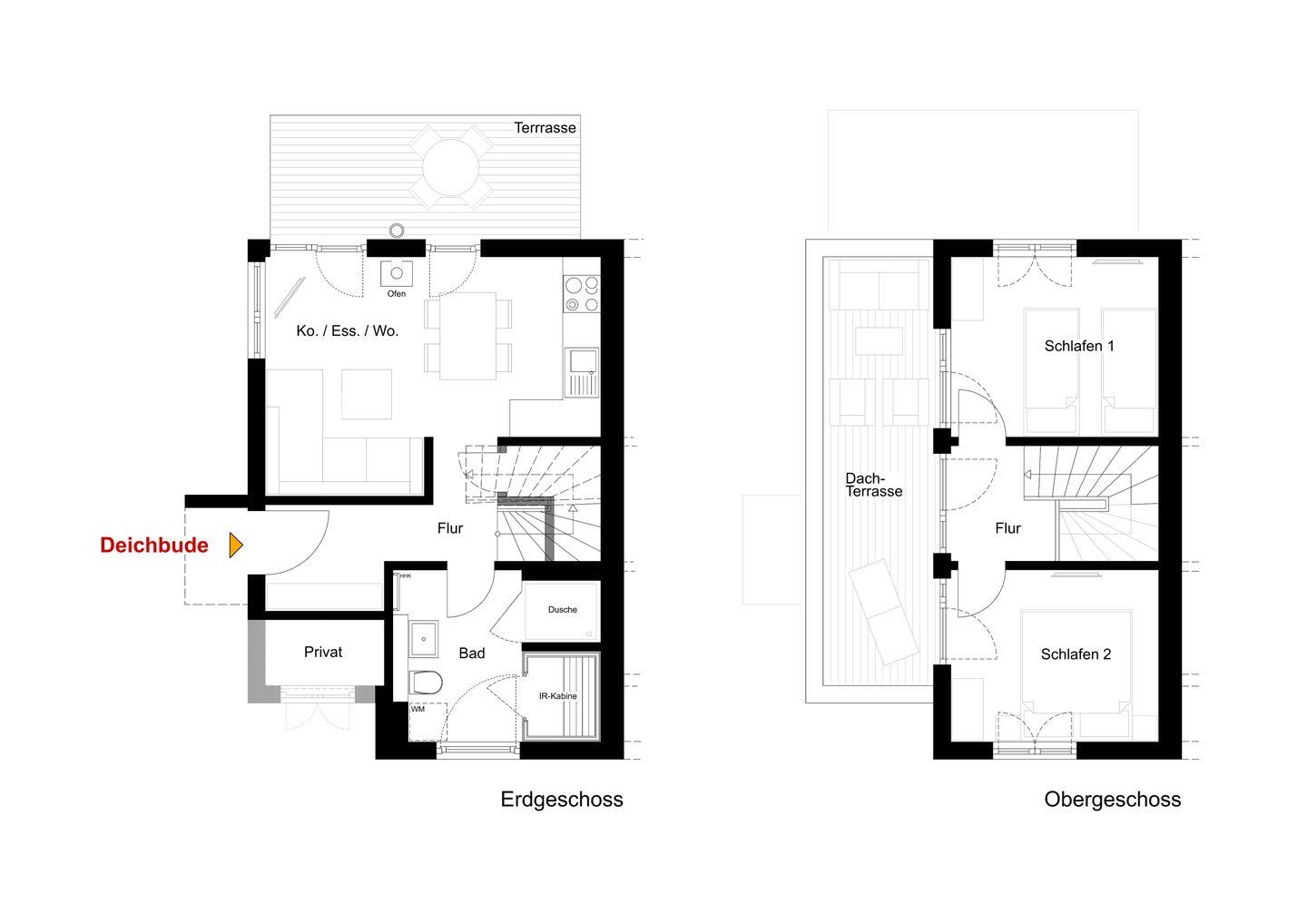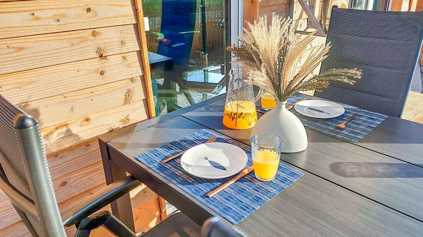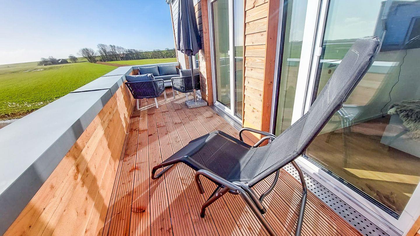 Ein Fahrradständer steht zum sicheren Abstellen deiner Räder bereit. Die umweltfreundliche Bauweise und nachhaltige Ausstattung runden das Urlaubskonzept ab. Die Dachterrasse mit Loungemöbeln und Sonnenliege ist ein echtes Highlight – genieße hier deine ganz private Auszeit mit Blick auf den Deich.