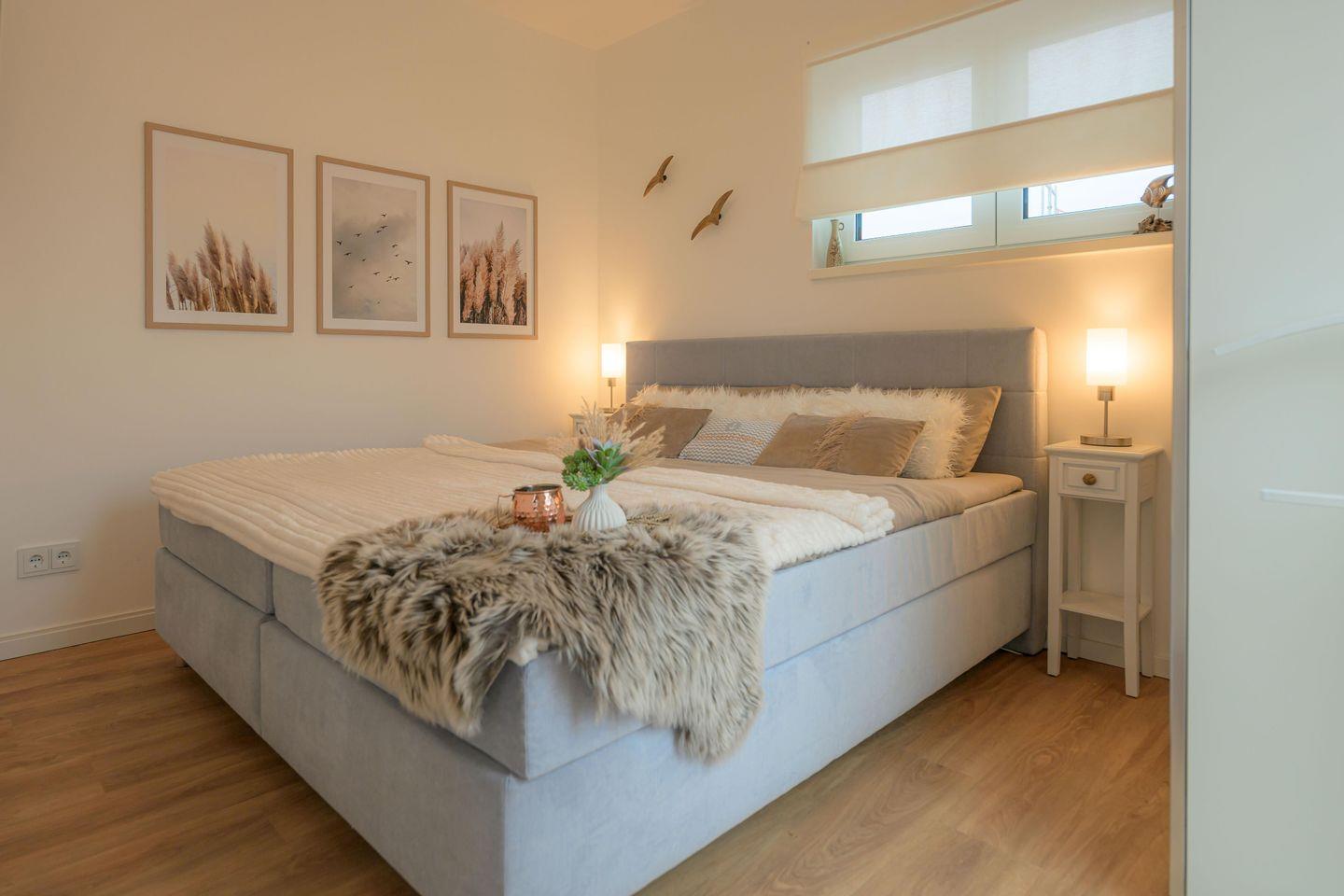 Im Obergeschoss befinden sich zwei liebevoll eingerichtete Schlafzimmer – eines mit komfortablem Boxspringbett, das andere mit zwei Einzel-Boxspringbetten. Beide Zimmer sind mit Smart-TV, Verdunkelung und viel Stauraum ausgestattet – ideal für Paare, Familien oder Freunde.