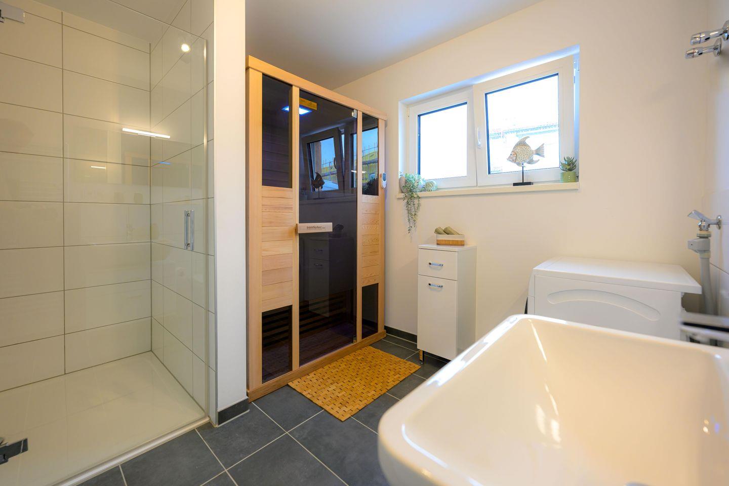 Nach einem Tag an der Nordseeluft wartet dein privater Wellnessbereich: Das großzügige Badezimmer bietet eine moderne, bodengleiche Dusche und eine Infrarotsauna – perfekt zum Abschalten und Regenerieren.