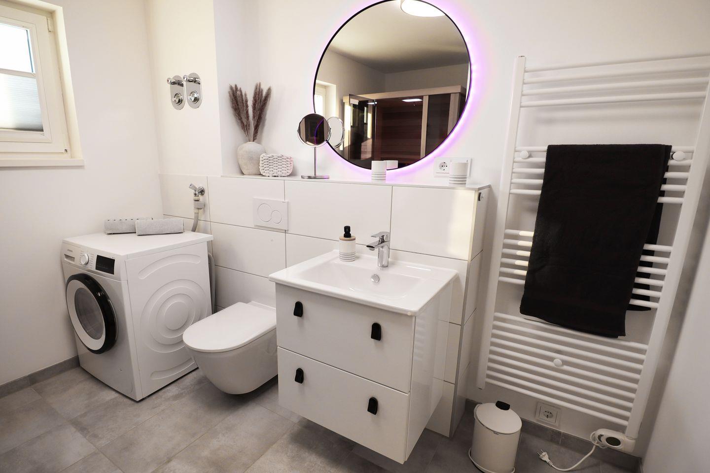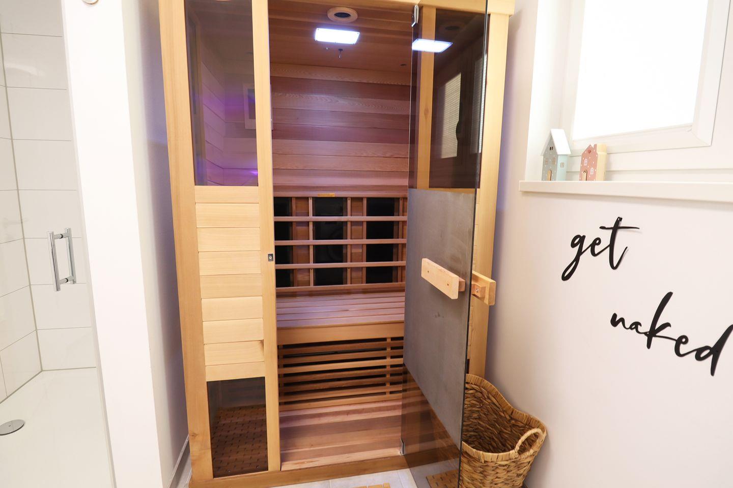 Das moderne Badezimmer verwöhnt dich mit einer großzügigen, bodengleichen Dusche und einer privaten Infrarotsauna – perfekt zum Abschalten. Genieße dein persönliches Wellnessprogramm ganz privat.
