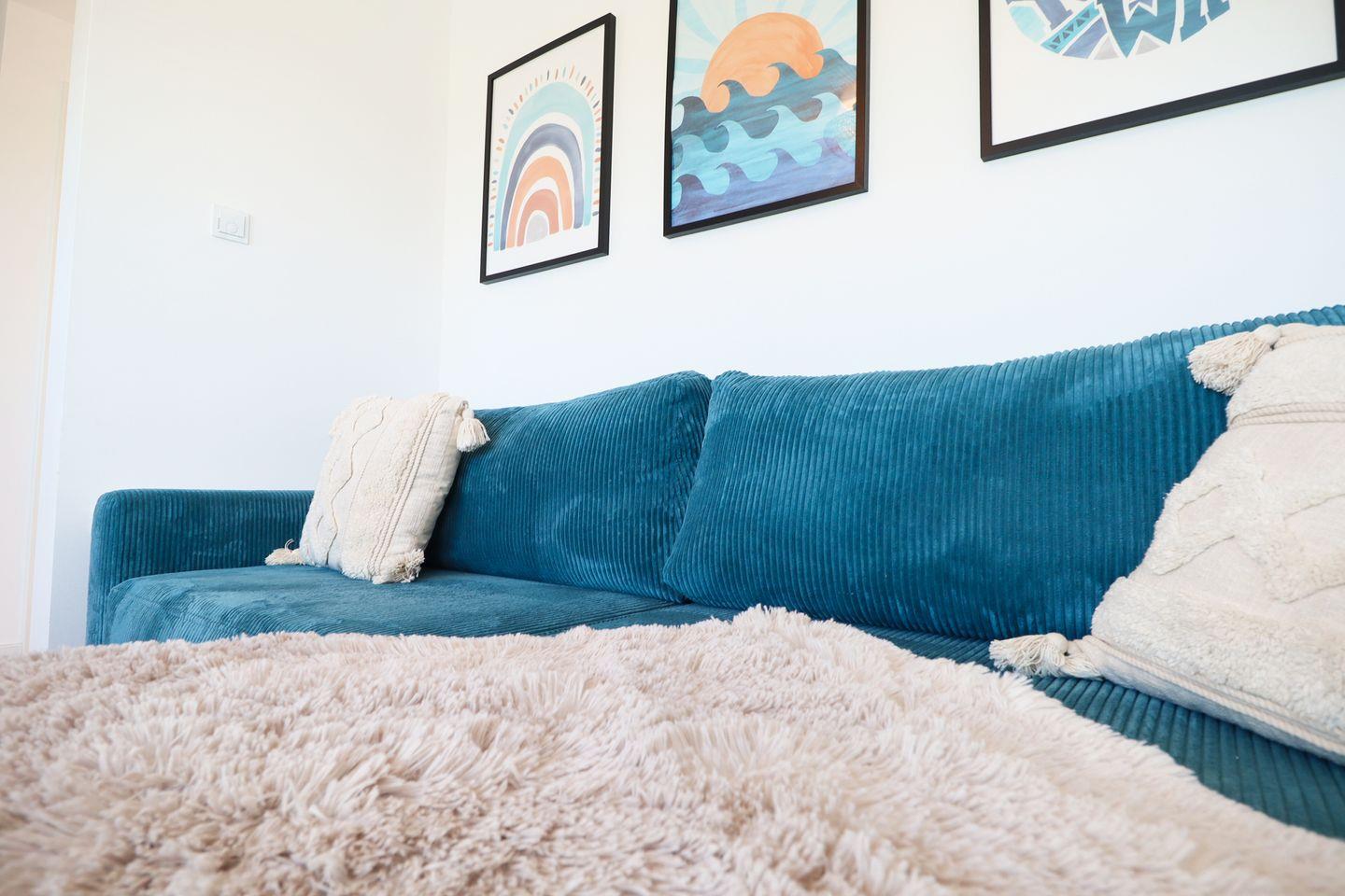 Im hellen Wohnbereich mit bodentiefen Fenstern lässt es sich wunderbar entspannen. Der Kamin sorgt für behagliche Stimmung – perfekt nach einem windigen Tag am Strand. Die offene Küche ist komplett ausgestattet und lädt zum gemeinsamen Kochen ein. Von hier aus gelangst du direkt auf die Terrasse mit Gartenmöbeln und Sonnenplatz.